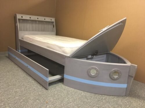 This is a boat bed we built for a customer in November 2016. It is actually the second identical boat bed for this customer. The distressing we did was some wormholes and rub throughs. In the headboard we added two curio lights and put a push button switch on the headboard. We also cut a couple 1 1/2″ holes for other alarm clock or other chords to pass.
