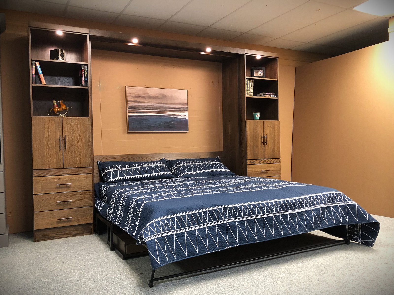 Flanking the bed are 24″ wide side cabinets designed for maximum organization. Each cabinet includes a mid-door section with a pull-out printer tray on both sides, making this layout especially well-suited for a home office or multi-use room.