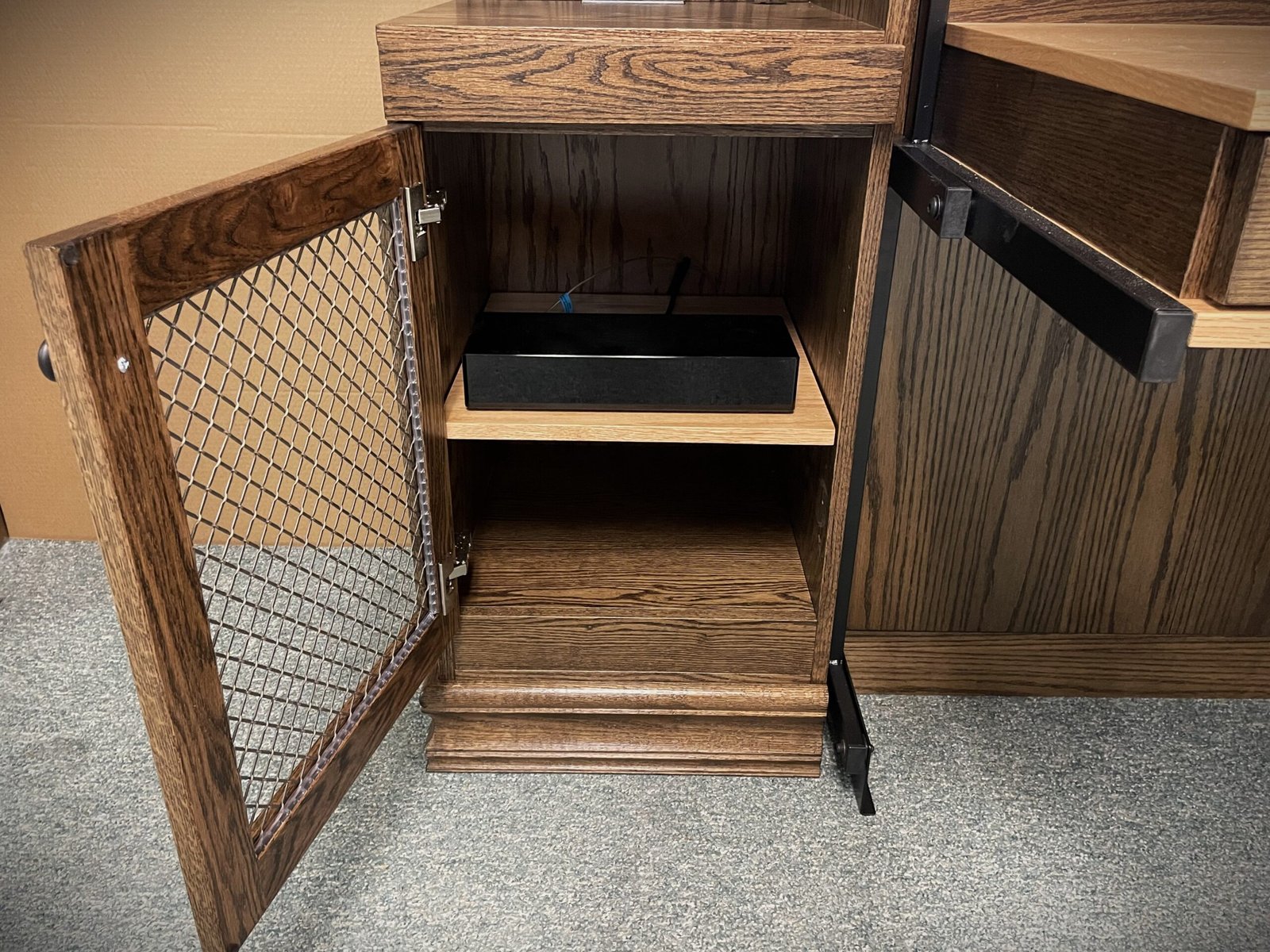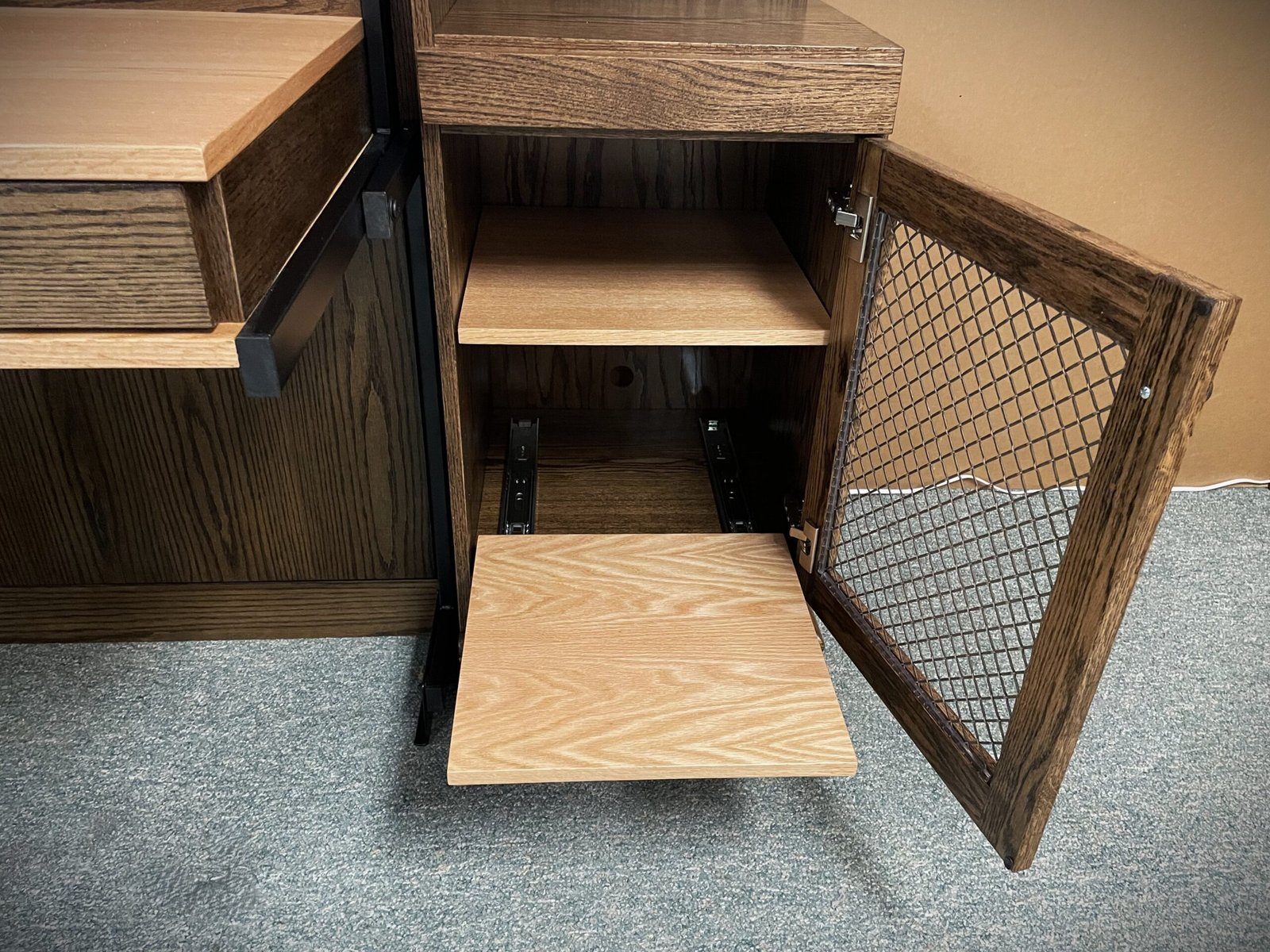 The metal grid adds a modern industrial style while allowing remote signals to pass through, making it ideal for housing the One Connect box and other components. The right-side cabinet also includes a convenient printer pullout, further enhancing the home office functionality.