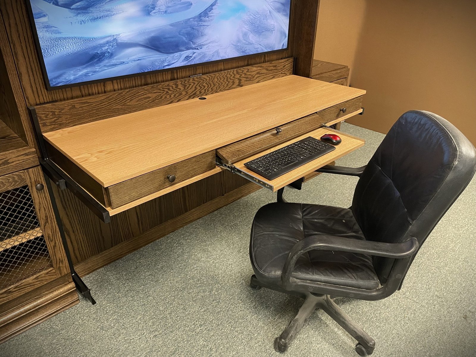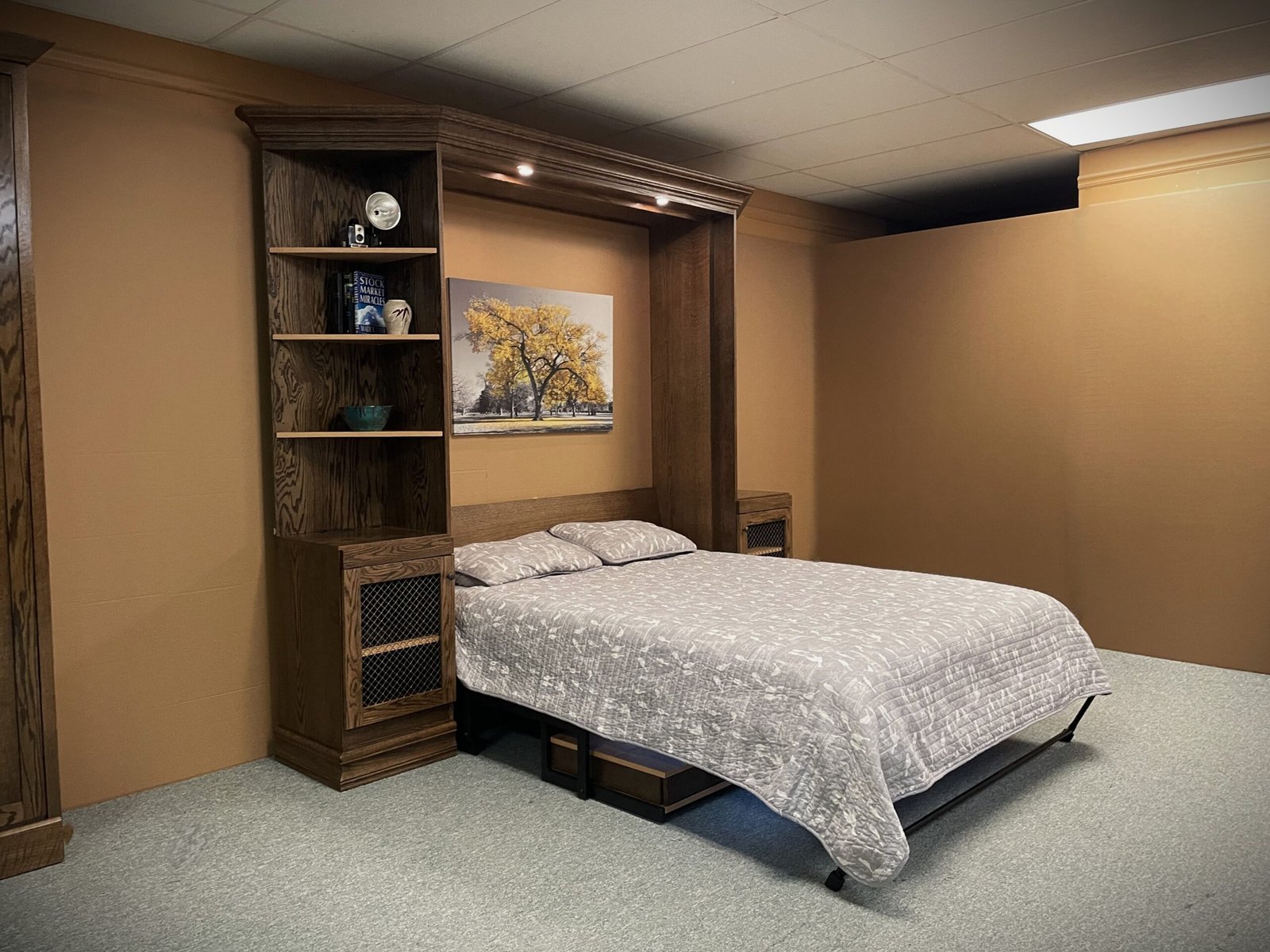 This Murphy bed was designed to combine a full entertainment center, a functional workspace, and a comfortable sleeping area into one clean, built-in solution. The two-tone finish adds contrast and character, giving the unit a custom, high-end appearance that stands out in any room.