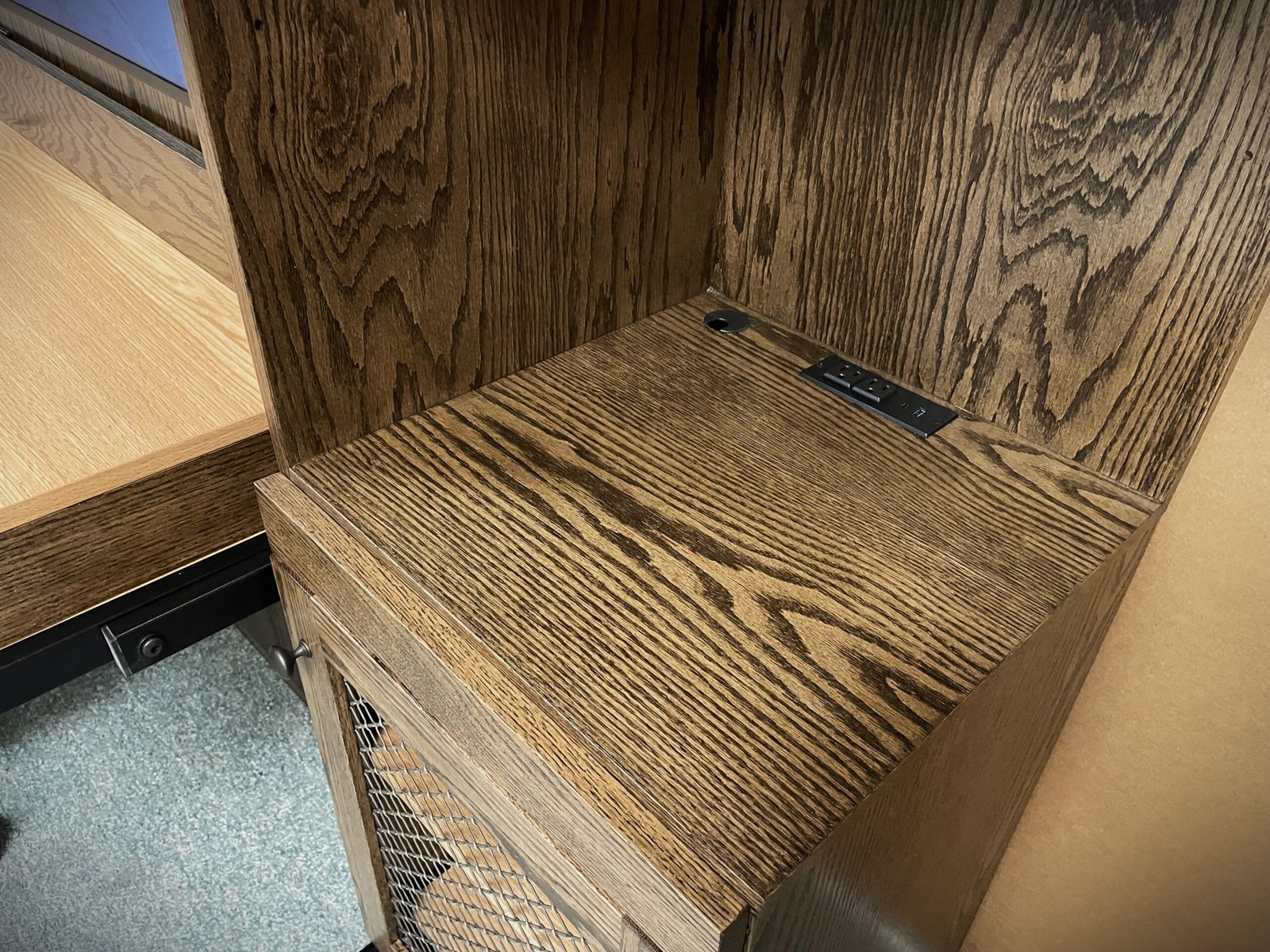 The fold-down desk continues the two-tone finish and is designed for everyday use. It includes: