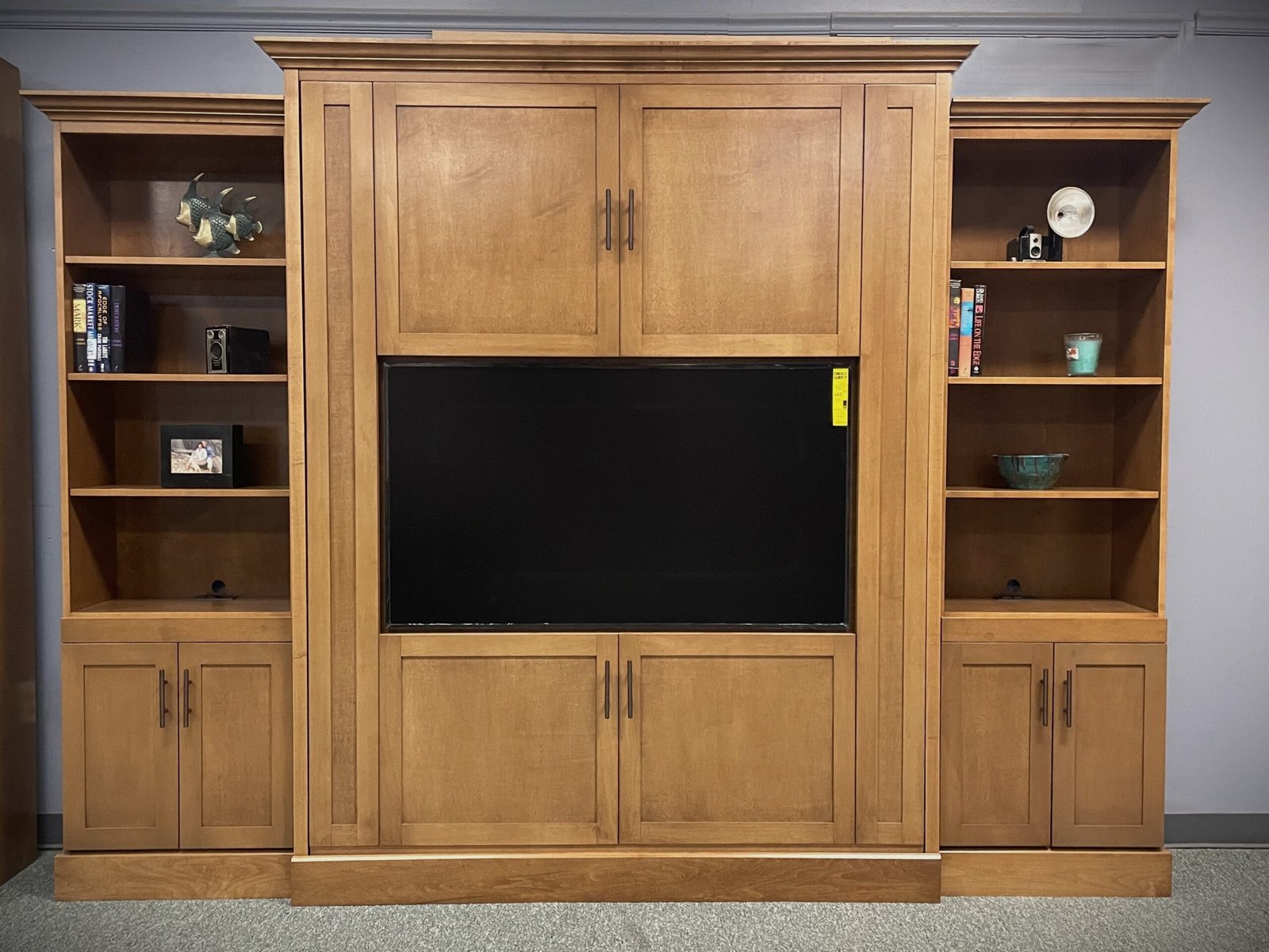 This entertainment center Murphy bed blends clean Shaker styling with high-end functionality, creating a beautiful focal point for any multi-purpose room. Built from solid maple and finished in a custom color match, this piece offers a furniture-grade look that feels both timeless and refined.