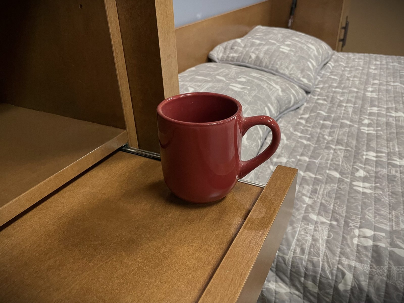 Flanking the bed are two 24″ wide bookcases that provide generous storage and everyday convenience. The upper sections feature adjustable wood shelves, while the lower cabinets include doors and a pull-out drink tray. Each bookcase is also equipped with a built-in charging station that includes two standard outlets, a USB-A port, and a USB-C port, making it easy to power phones, tablets, and other devices.