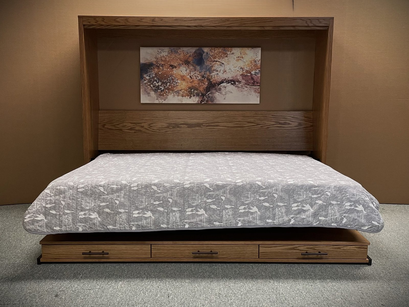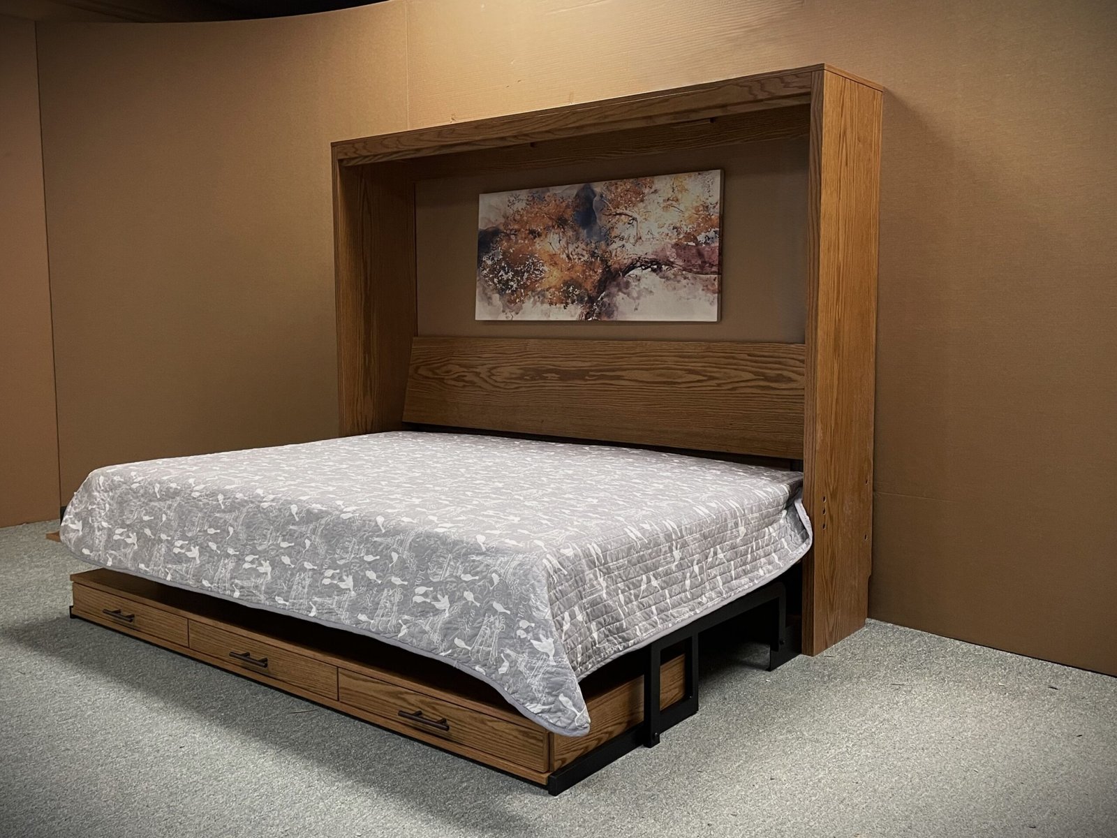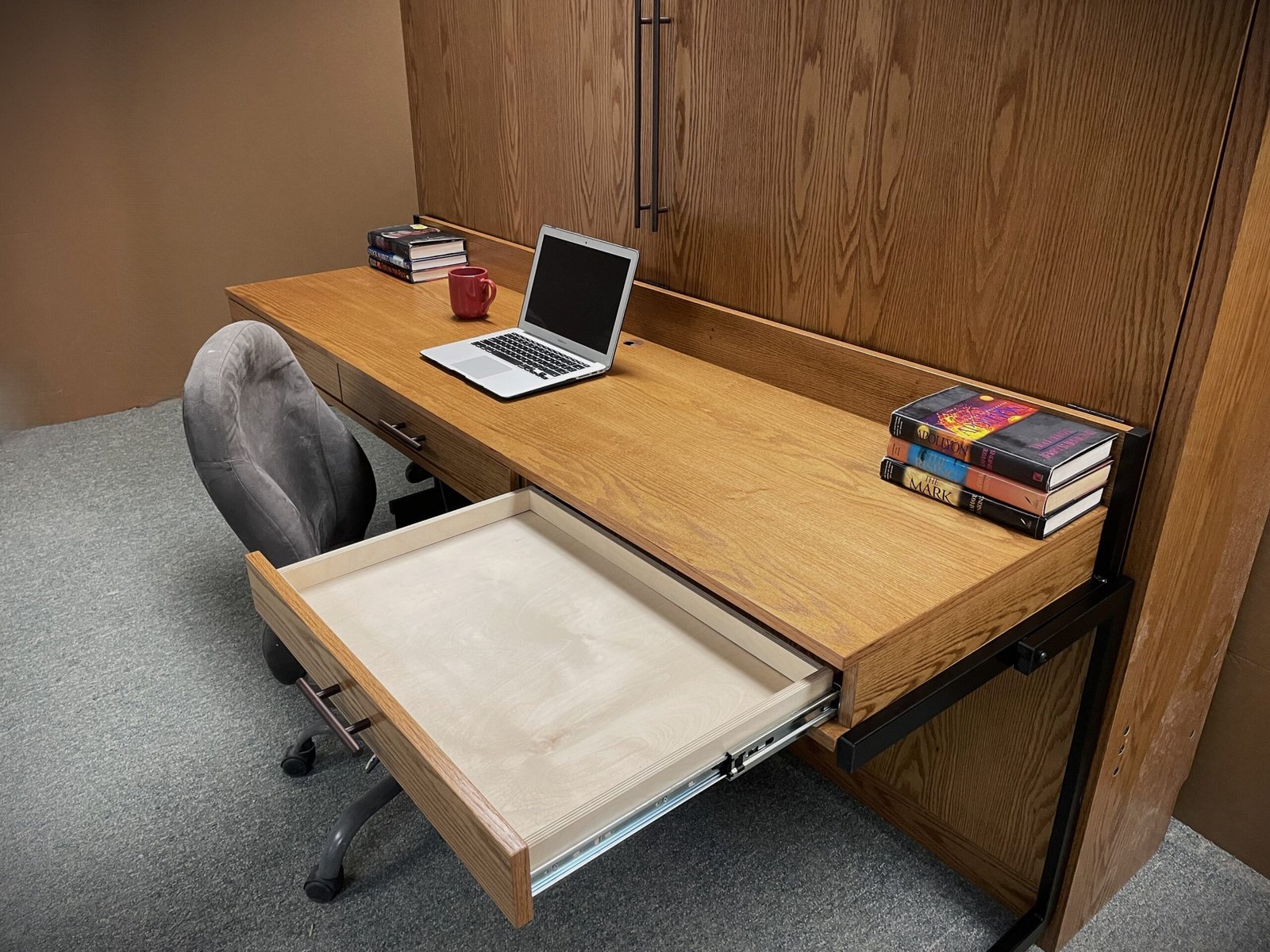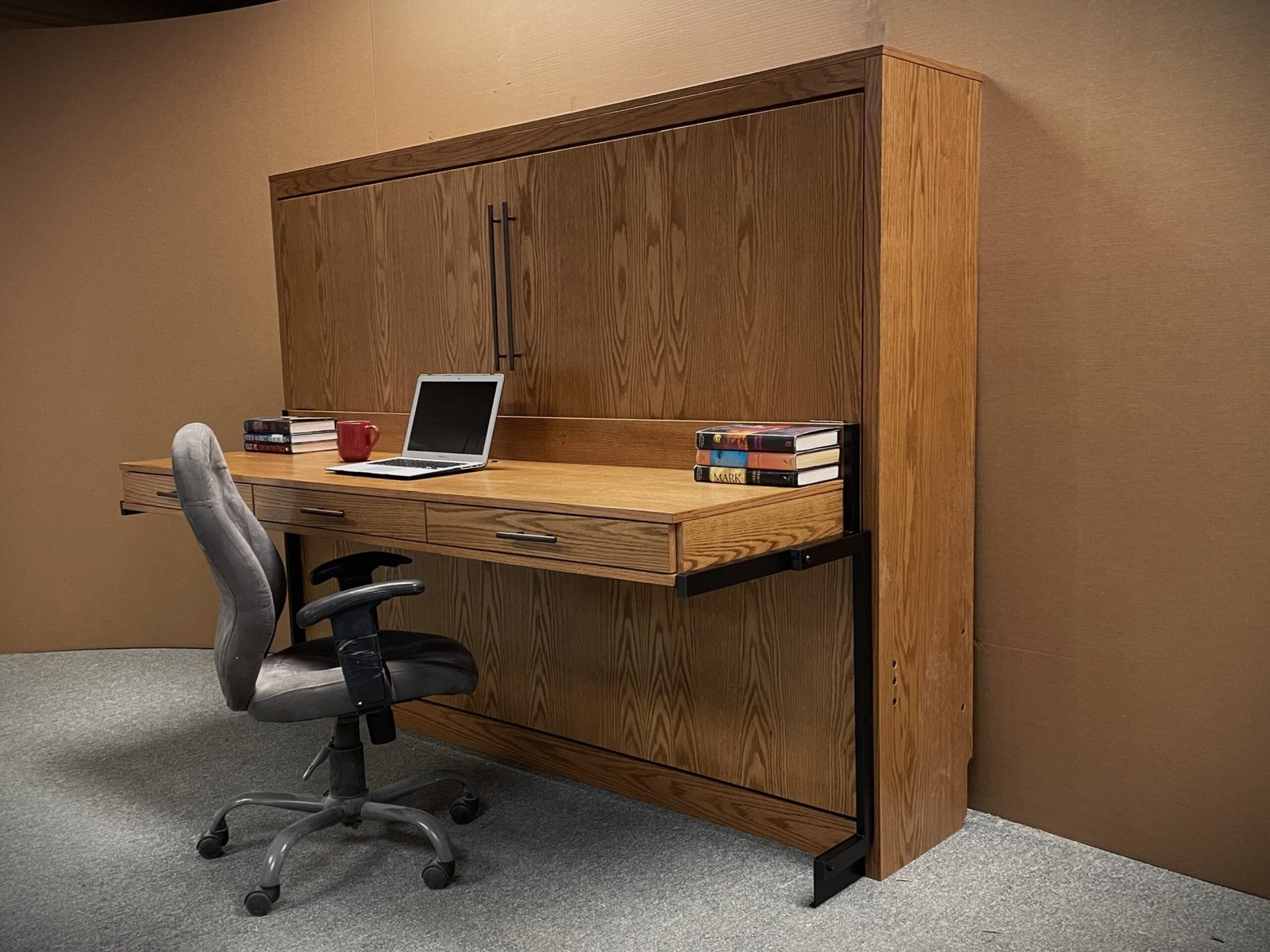 This is a Full Horizontal Alpine Murphy Bed. It is a very contemporary face design. It is made out of Oak wood with a Golden Oak stain. We added a Stay Level Desk with Three Pencil Drawers. This Murphy Bed unit is perfect for any home office/guest bedroom combo room.