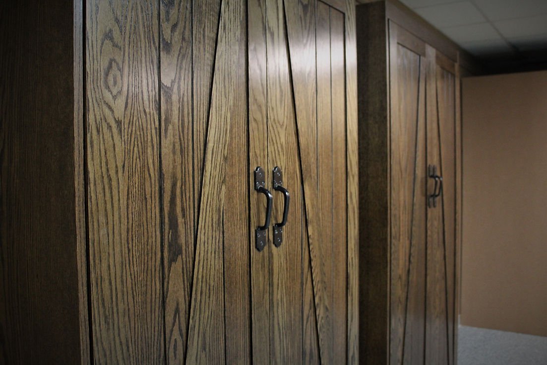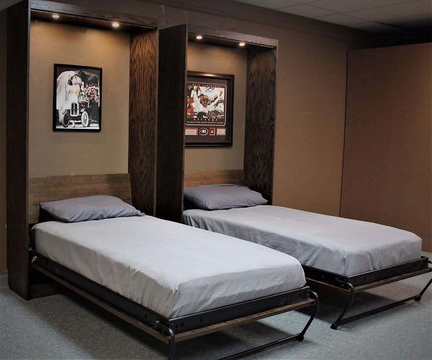 This is a Murphy bed that is designed to look like a pair of barn doors. The face is a total of 1 inch thick. To keep with that rustic look we use gate pulls for the handles.