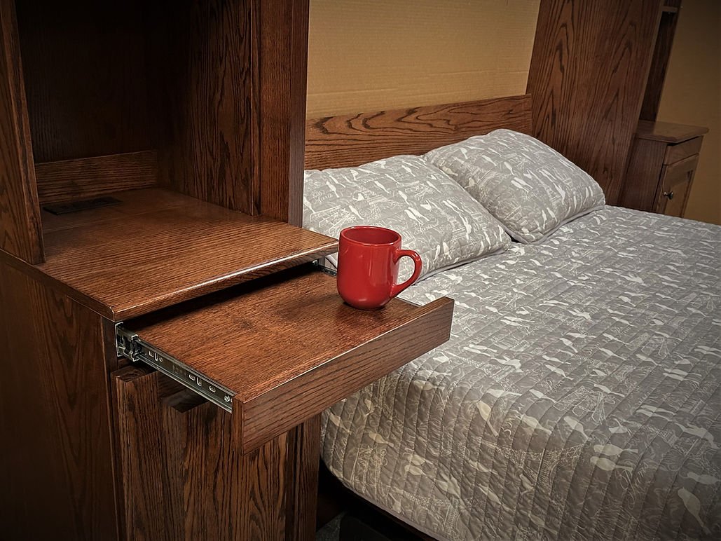 This is the most popular of the Raised Panel styles. This one has four raised panel doors on the face. The top of the doors can be straight or arch to it. We also added our Stay Level Desk, which is a great feature to combine a home office and guest bedroom!