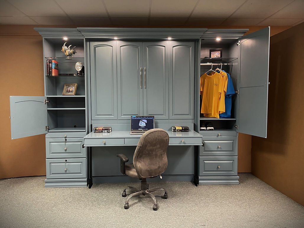 This is the most popular of the Raised Panel styles. This one has four raised panel doors on the face. The top of the doors can be straight or arch to it. We also added our Stay Level Desk, which is a great feature to combine a home office and guest bedroom!