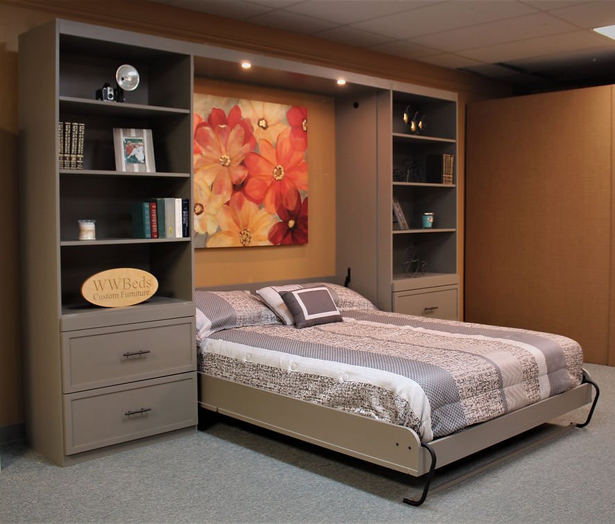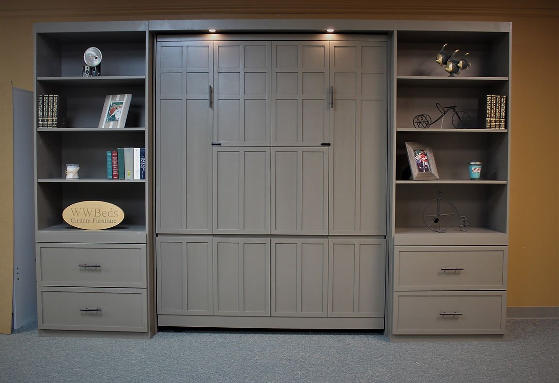 We can take most of our Inset desk versions and turn them into a Double fold desk. The desk on this is approximately 83″ long, folds twice and is hidden in the face of the Murphy bed.