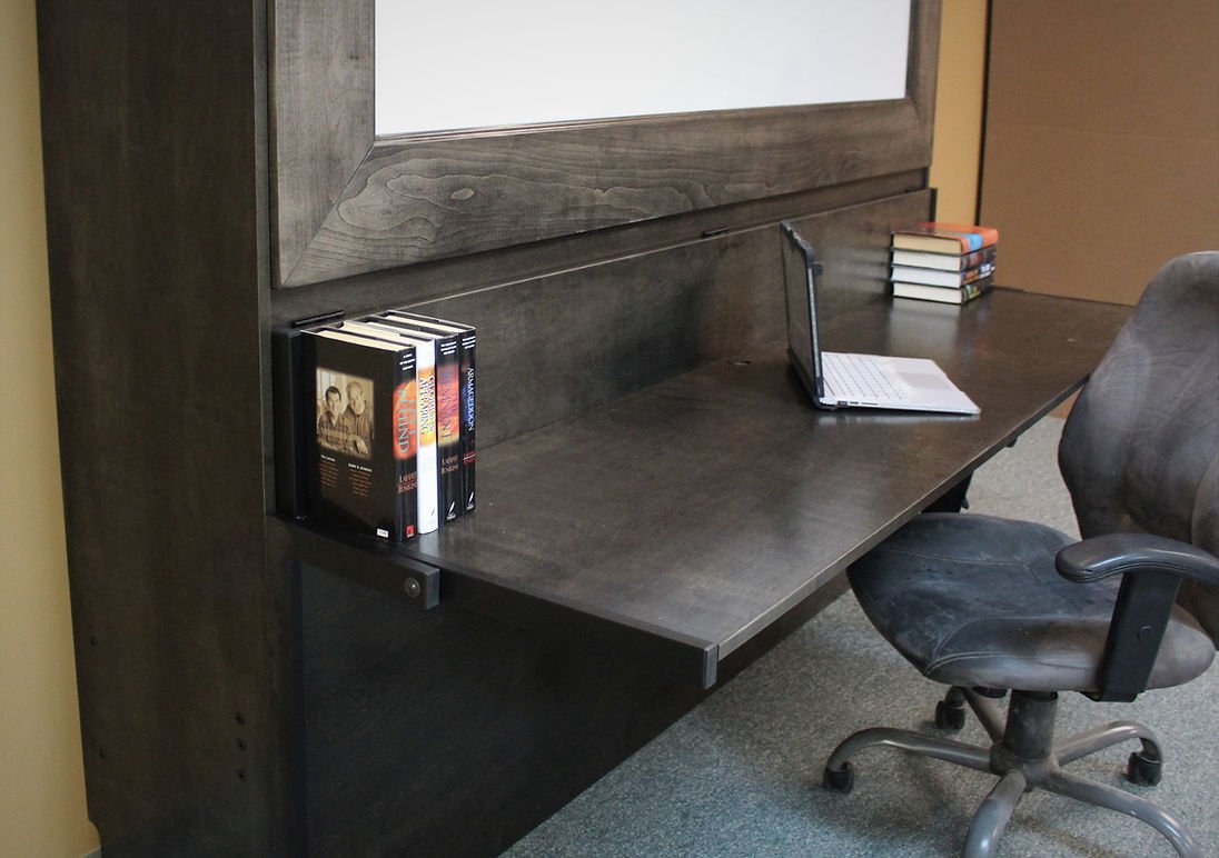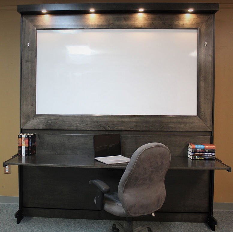This Murphy Bed is designed to be used as a dry-erase board. We framed the whiteboard section. This bed also has a stay-level desk with it. This is the perfect addition to a home office.