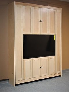 This unique Murphy bed is designed to double as a stunning entertainment center, seamlessly blending functionality and style. Crafted from premium maple wood with a clear coat finish, it features a distinctive face design. You’ll notice the face has a little bit different design. The doors above and below the doors are half the size and doubled up. We did this to make the larger panels on the side be real close to the size of the smaller door panels.
