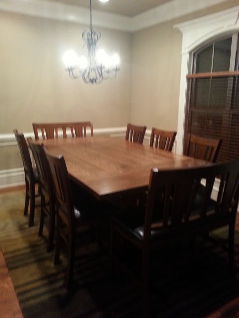 This is a custom table built in March 2015. It is 54″w x 96″l x 36″h. With it being 36″ high, it was designed to be used with bar height chairs. We can build this one to whatever height you want.