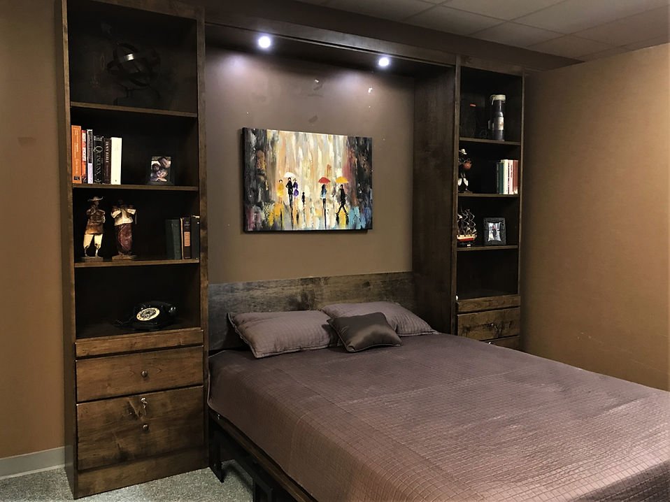 This one has a desk on the front that stays level as it transistions into a bed.  No need to totally clear off the desk section to use the bed. We added 24″ bookcaes with adjustable shelves on the top and 2 drawers and drink tray on the bottom.  The lower drawer was upgraded to a file drawer with a lock.