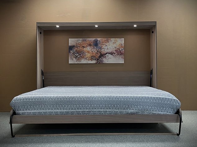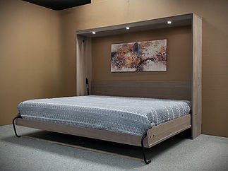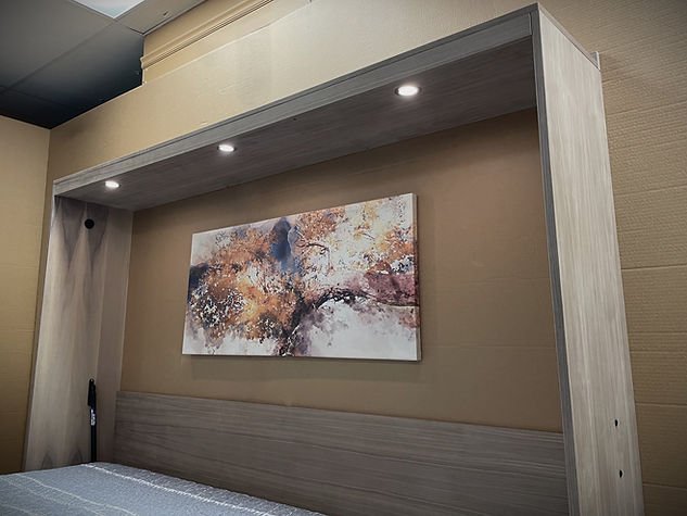 This one has the 75″ Samsung The Frame” LS003 Series. This is the most popular version used on these beds. This Television is made to fit tight against the wall and works well with this Murphy bed. The power cord is low profile and the accessories hook-up such as HDMI or Cable will be controlled by a box that can be placed anywhere. That box is connected by a very thin wire. Up to a 65″ will fit in this style murphy bed. We can even add a sound bar.
