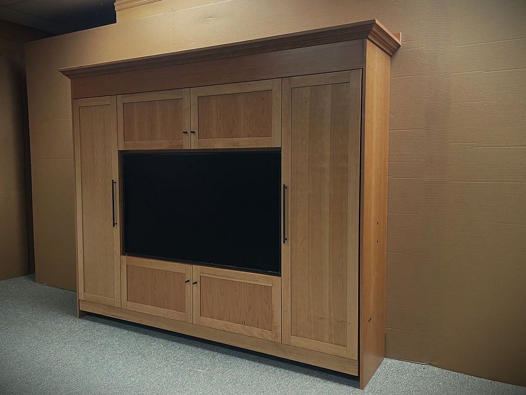 We used the Create-a-bed Murphy Bed Mechanism. The wood frame and adjustable pistons work well with this application and allows us to inset the TV into the face.