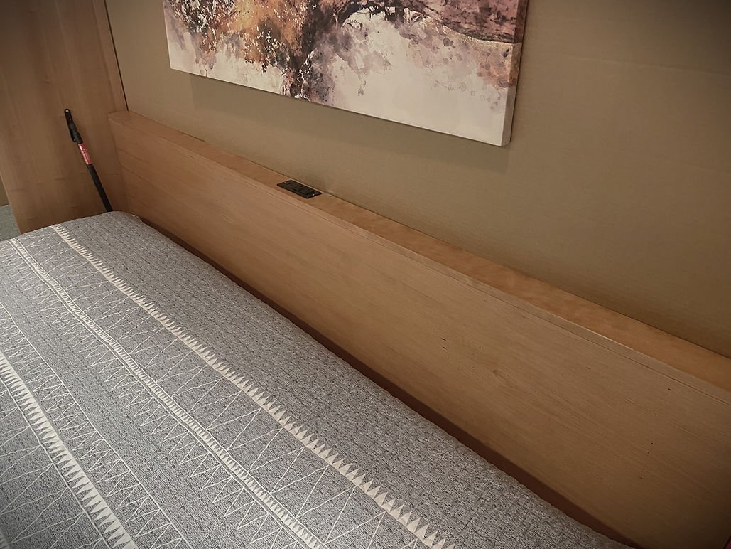 This one has the 55″ Samsung The Frame” LS003 Series. This is the most popular version used on these beds. This Television is made to fit tight against the wall and works well with this Murphy bed. The power cord is low profile and the accessories hook-up such as HDMI or Cable will be controlled by a box that can be placed anywhere. That box is connected by a very thin wire. Up to a 65″ will fit in this style murphy bed. We can even add a sound bar.