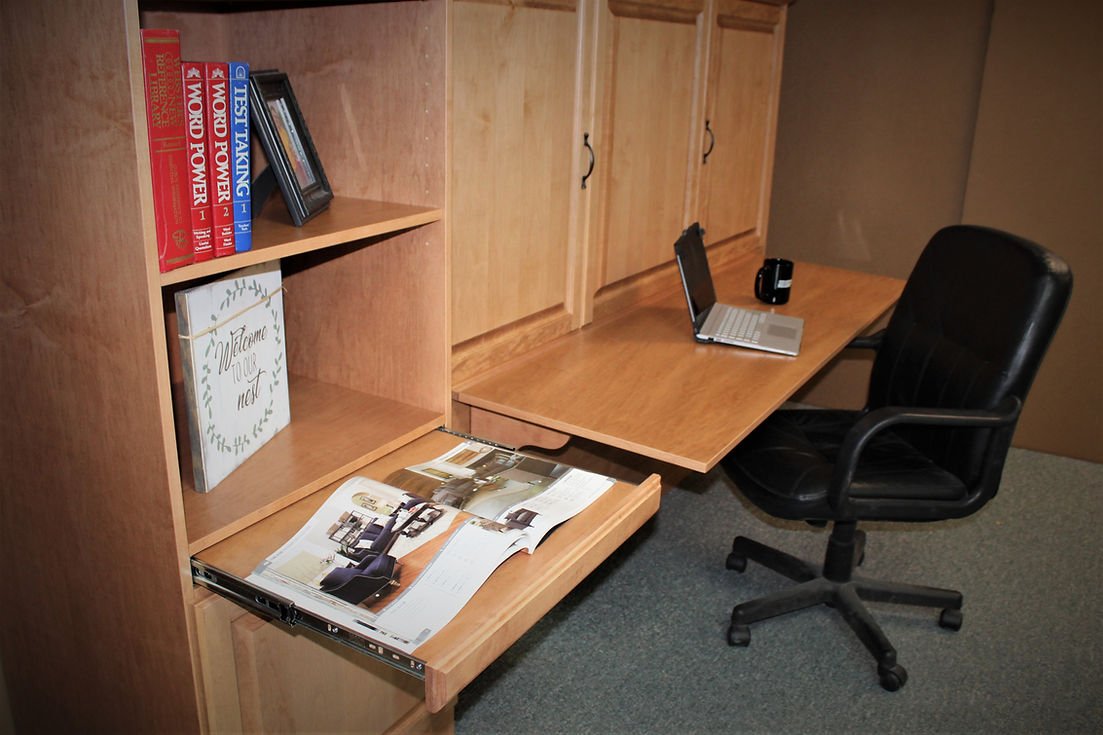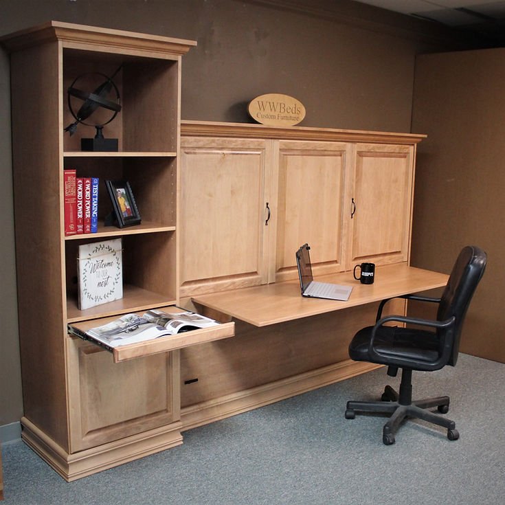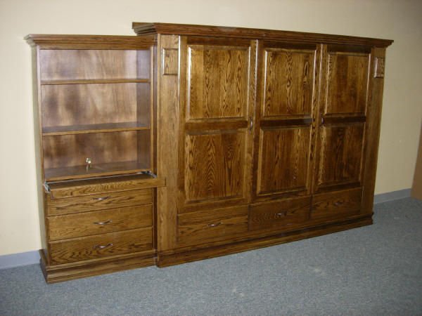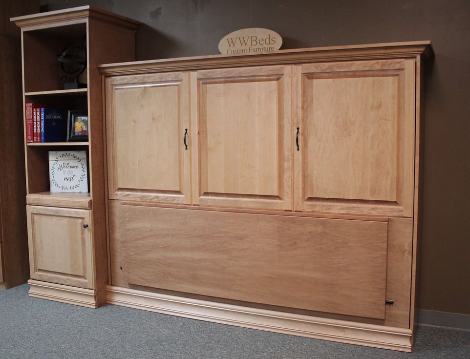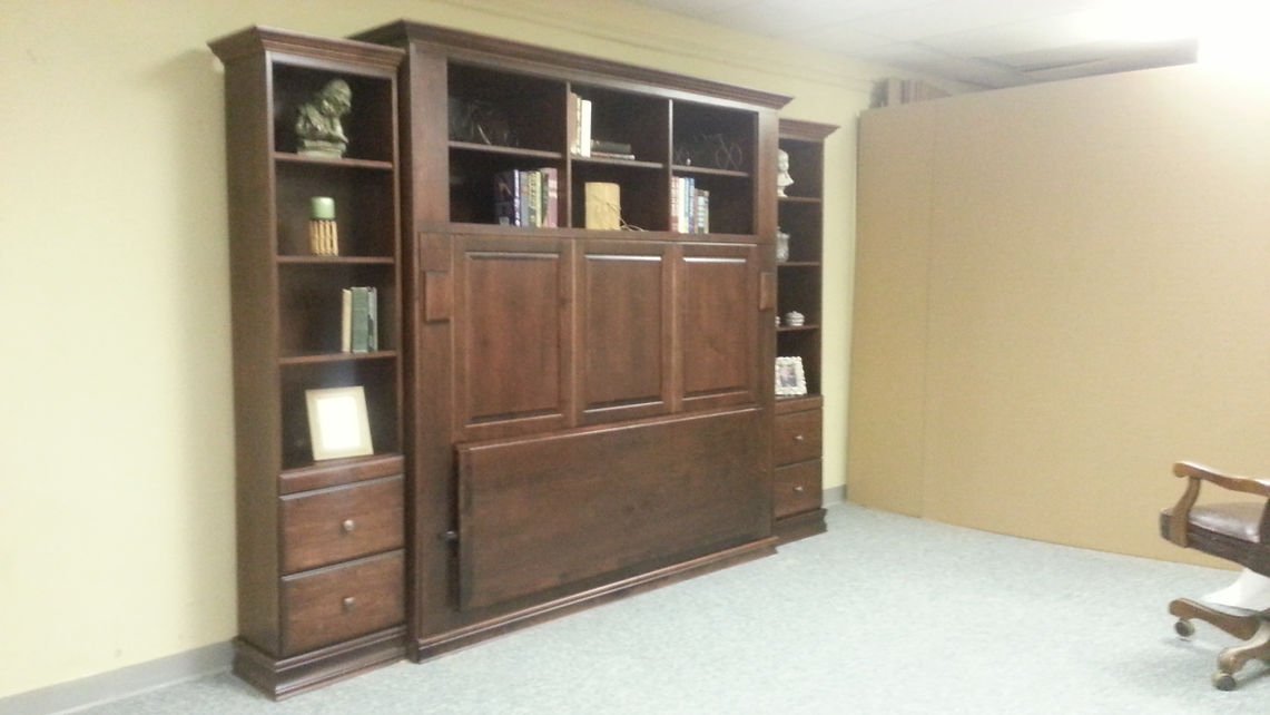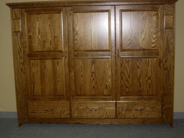 This horizontal (sideways) murphy wall bed has a raised panel face. We divided the face into thirds and put a door and drawer front in each section.