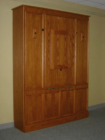 This bed is built with a desk that folds up onto the face of the Murphy bed. The face style has picture frame molding added to face to help hide the desk. This is perfect for a home office.