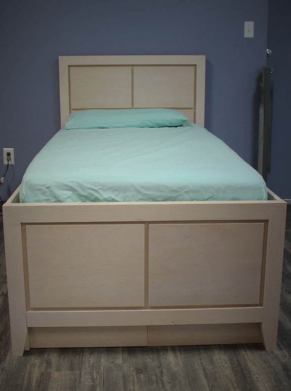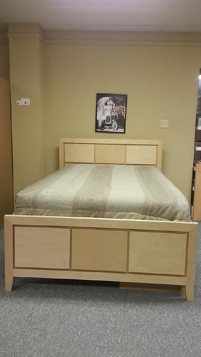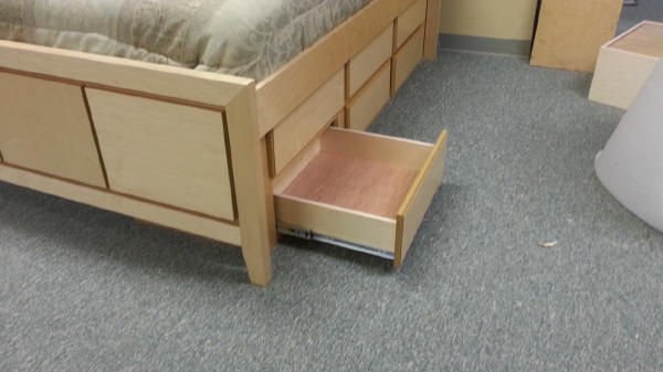 This one we built a little different. Usually w band or cover all exposed edges on maple plywood. On this one I switched to MDF core and left the edges raw on the inside panels and drawer fronts.. This gave it a little darker edge on the panels for the headboard and the drawer fronts. The edges of the headboard, footboard, side rails and drawer frame were banding with matching wood.