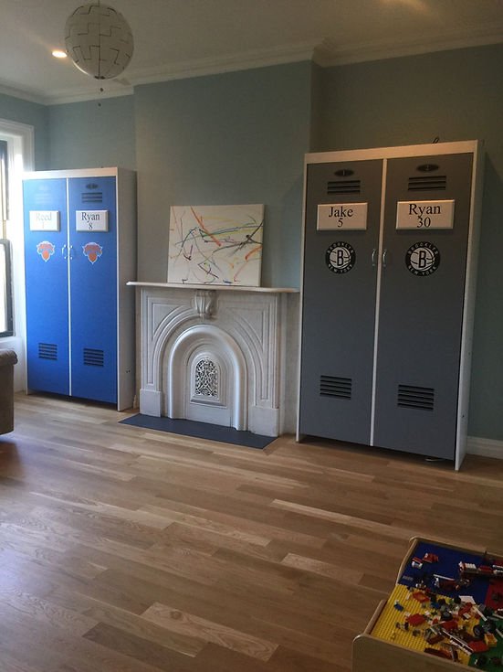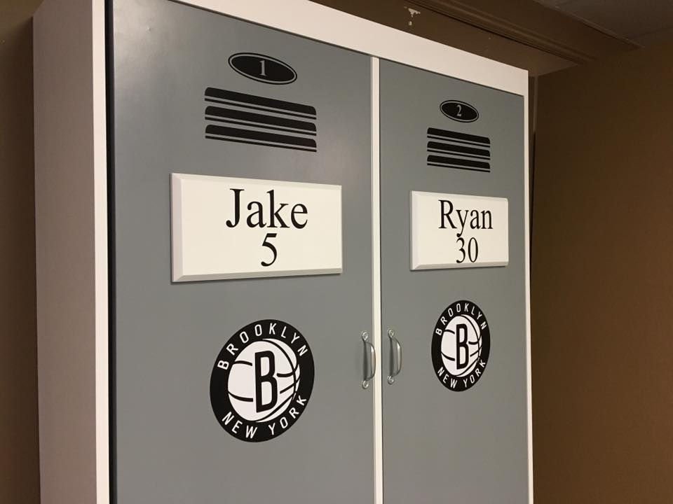 This is our Locker Muprhy bed desinged to look like a Brooklyn Nets Locker.  Shown in a twin size.  Other teams, themes, colors and sizes aviliable.