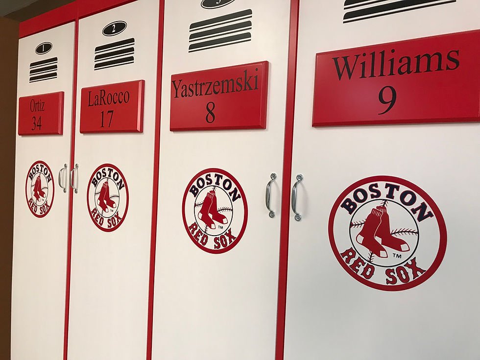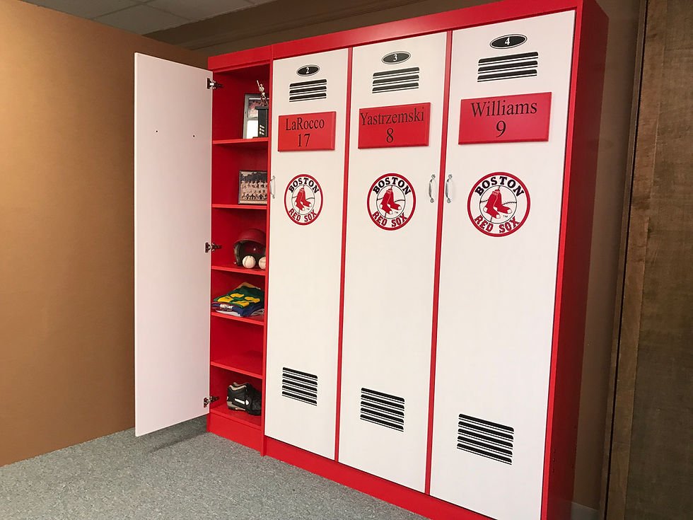 The is a murphy wall bed designed with a locker theme. This one is in a Red Sox Baseball theme, but others team are available. The locker doors come down to form the bed. Bookcases can be added in any amount. This example is shown with only one bookcase