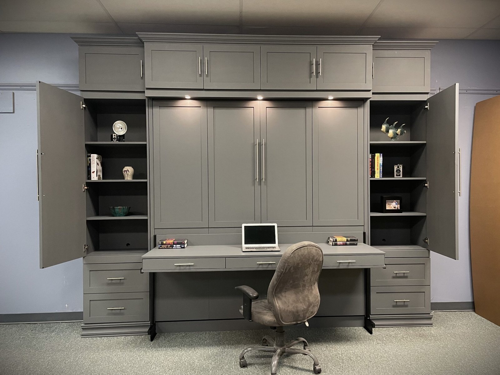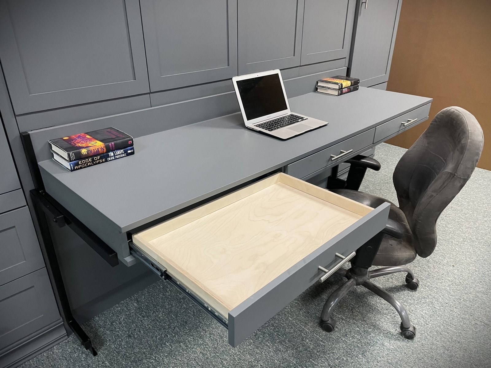 Take note of the style and features you may want.Designed for real life, this Murphy bed features our popular Stay Level Desk. The desk includes three built-in pencil drawers and remains perfectly level as the bed transitions from closed to open. That means you don’t have to completely clear off your workspace when it’s time to use the bed. It’s an ideal solution for creating a true dual-purpose room—part home office, part guest bedroom.