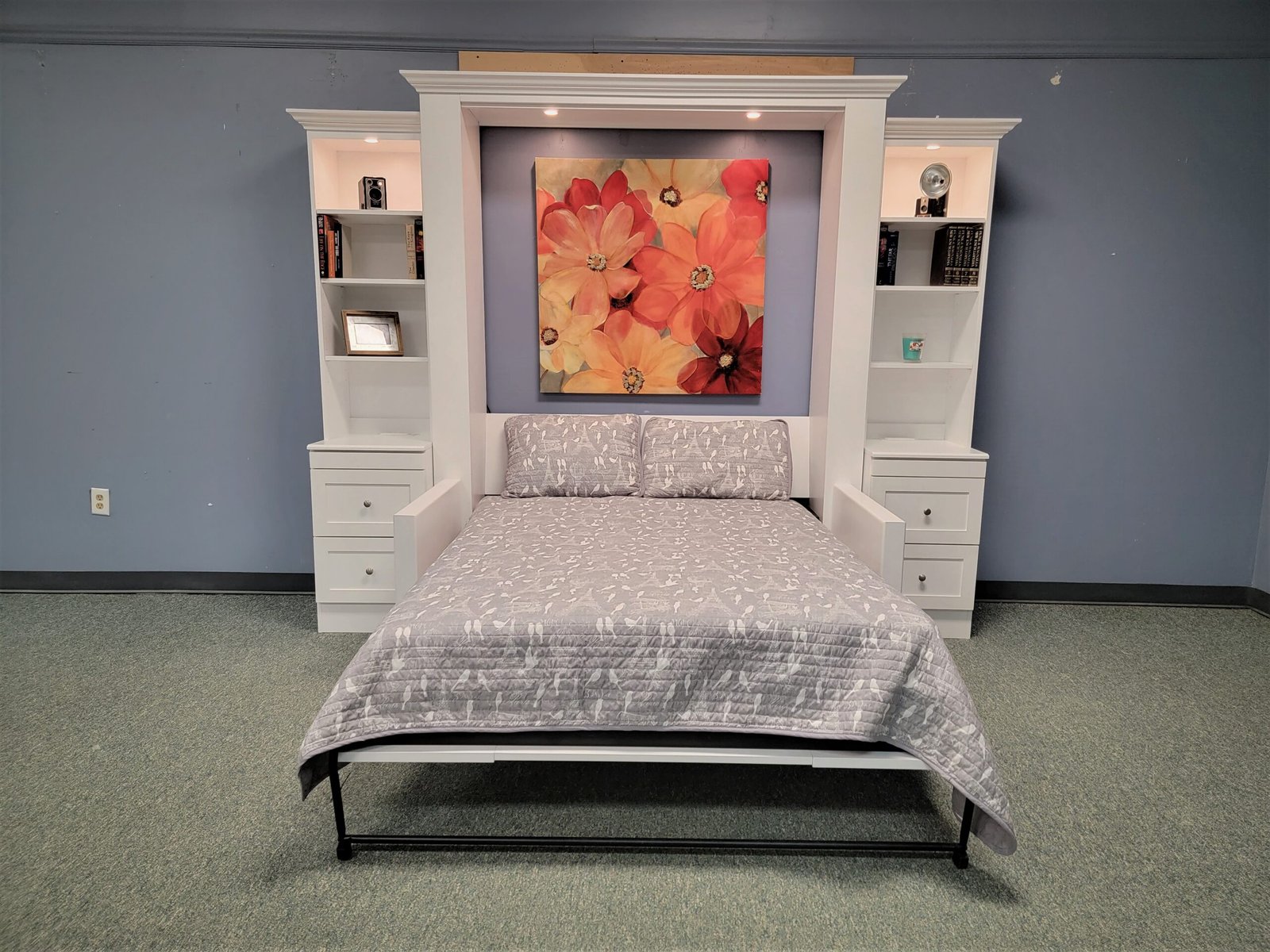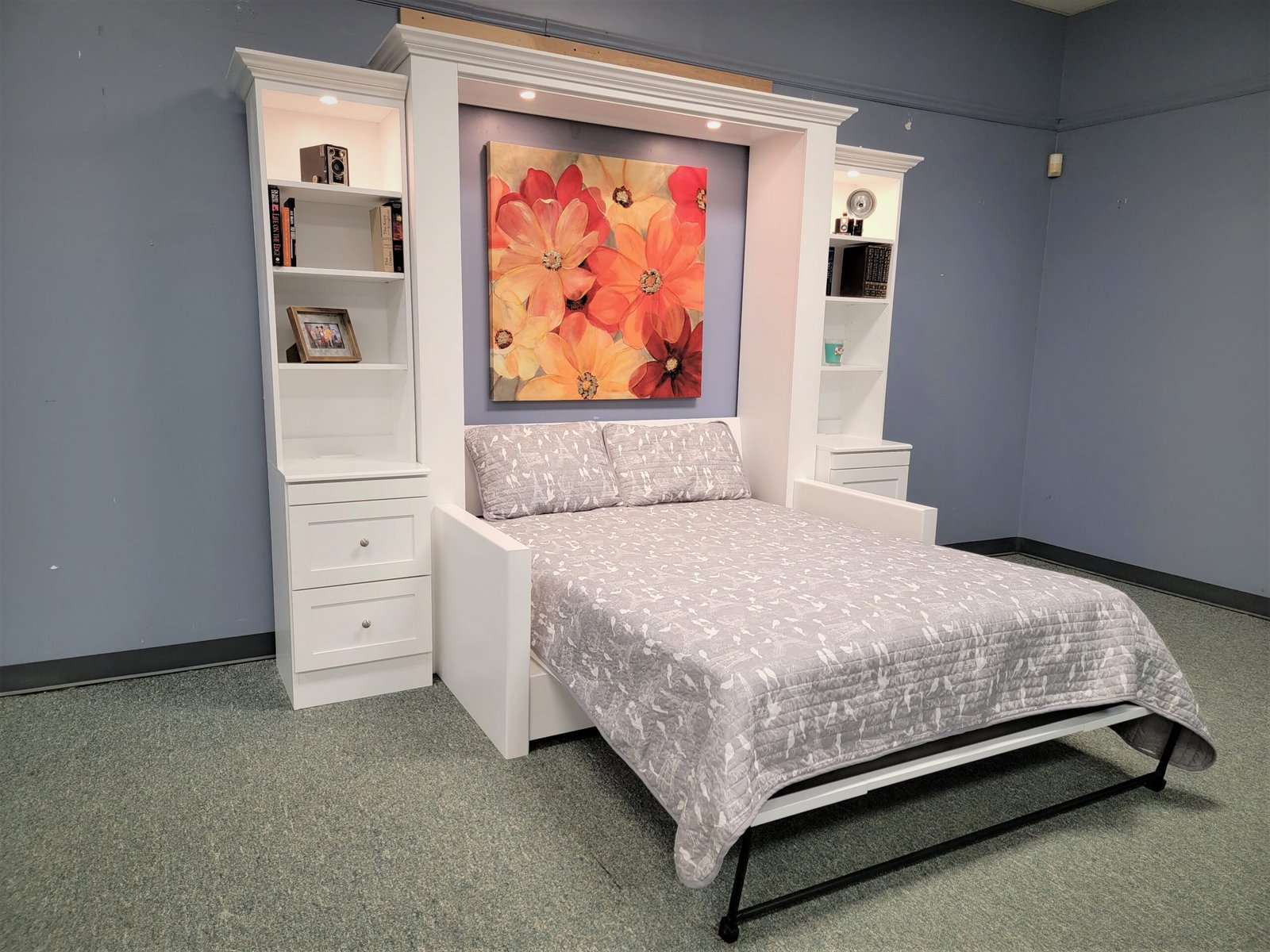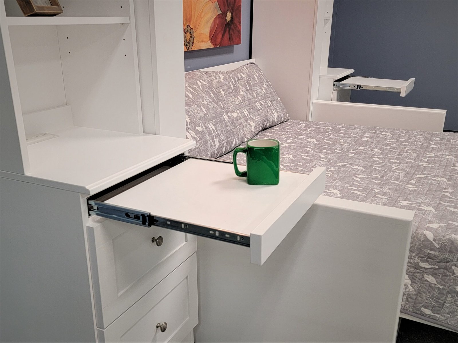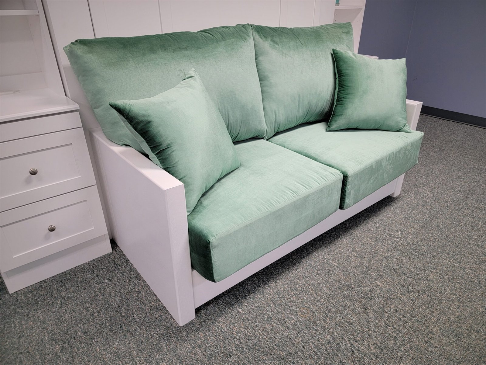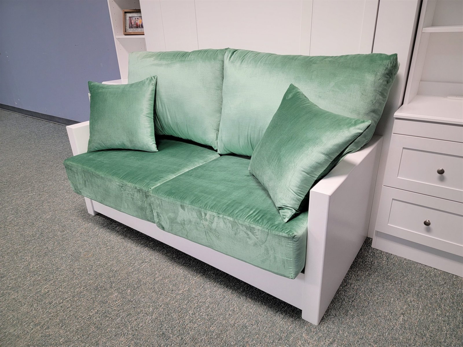 White Murphy bed with green sofa