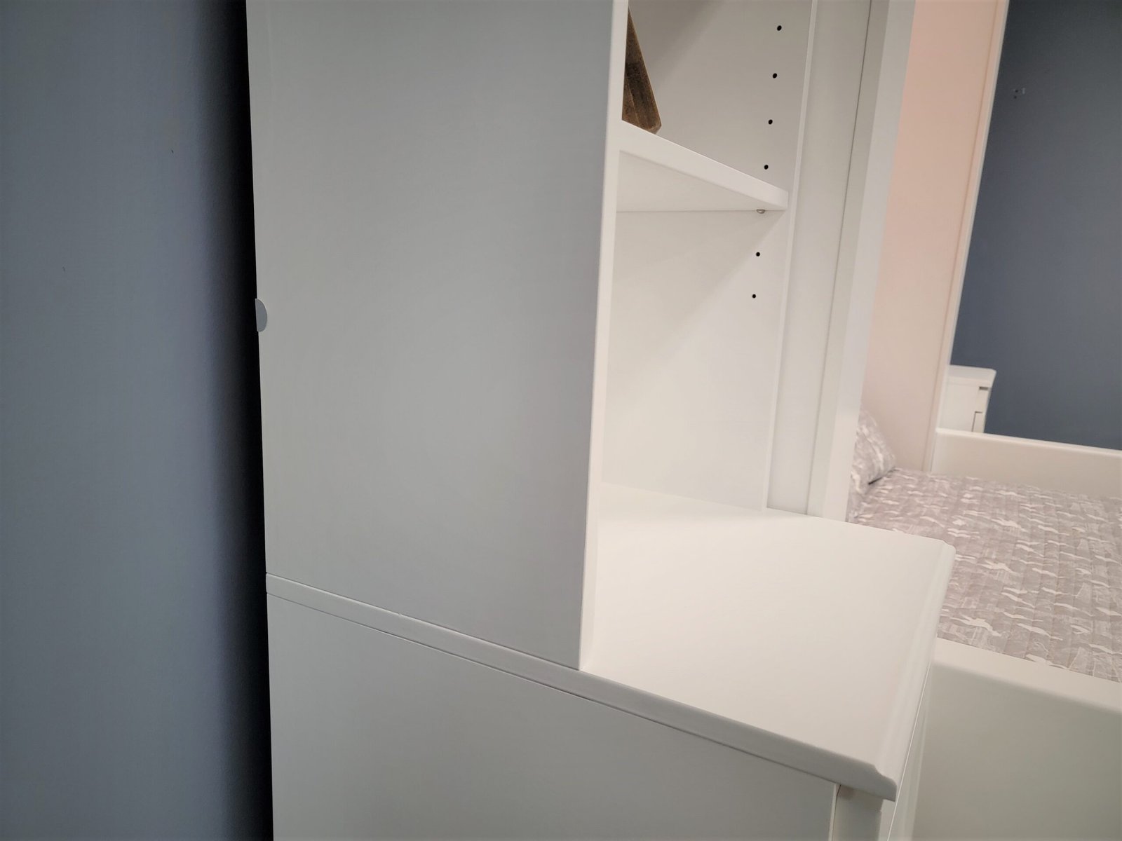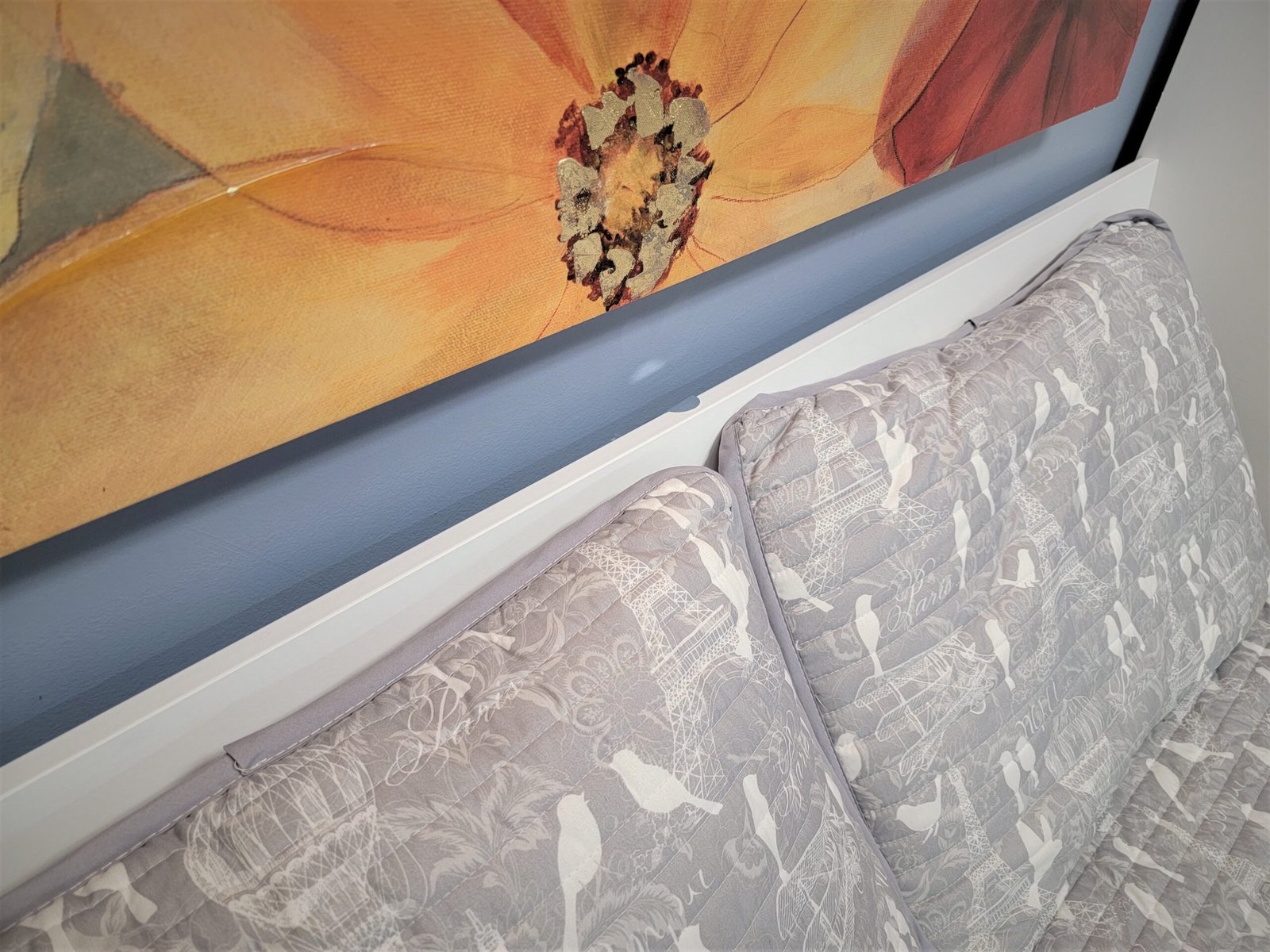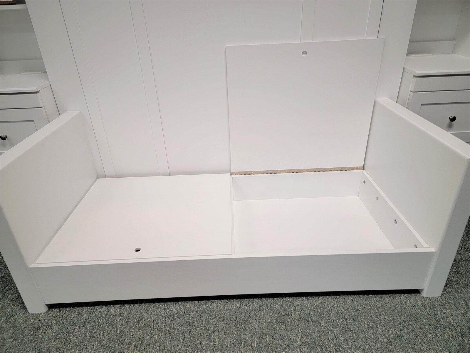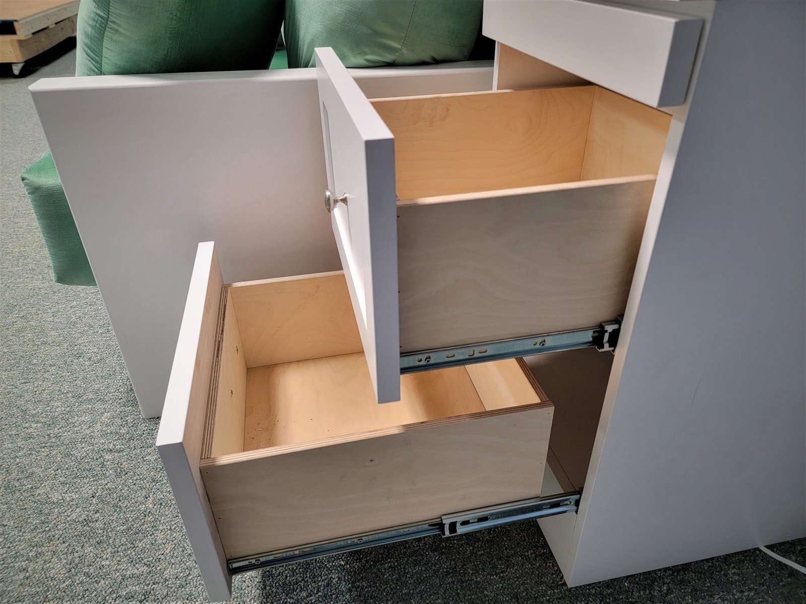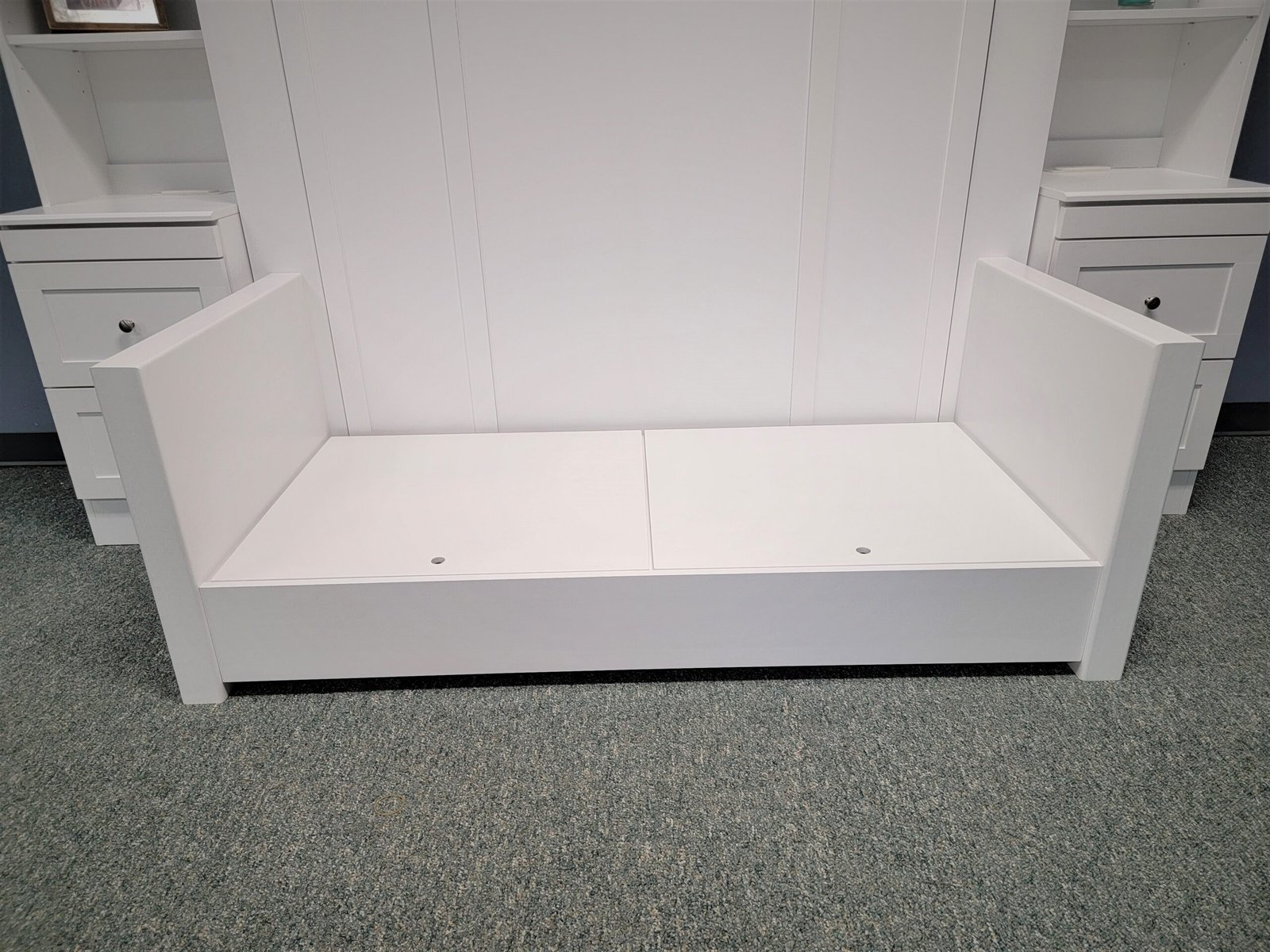 White Murphy bed with green sofa
