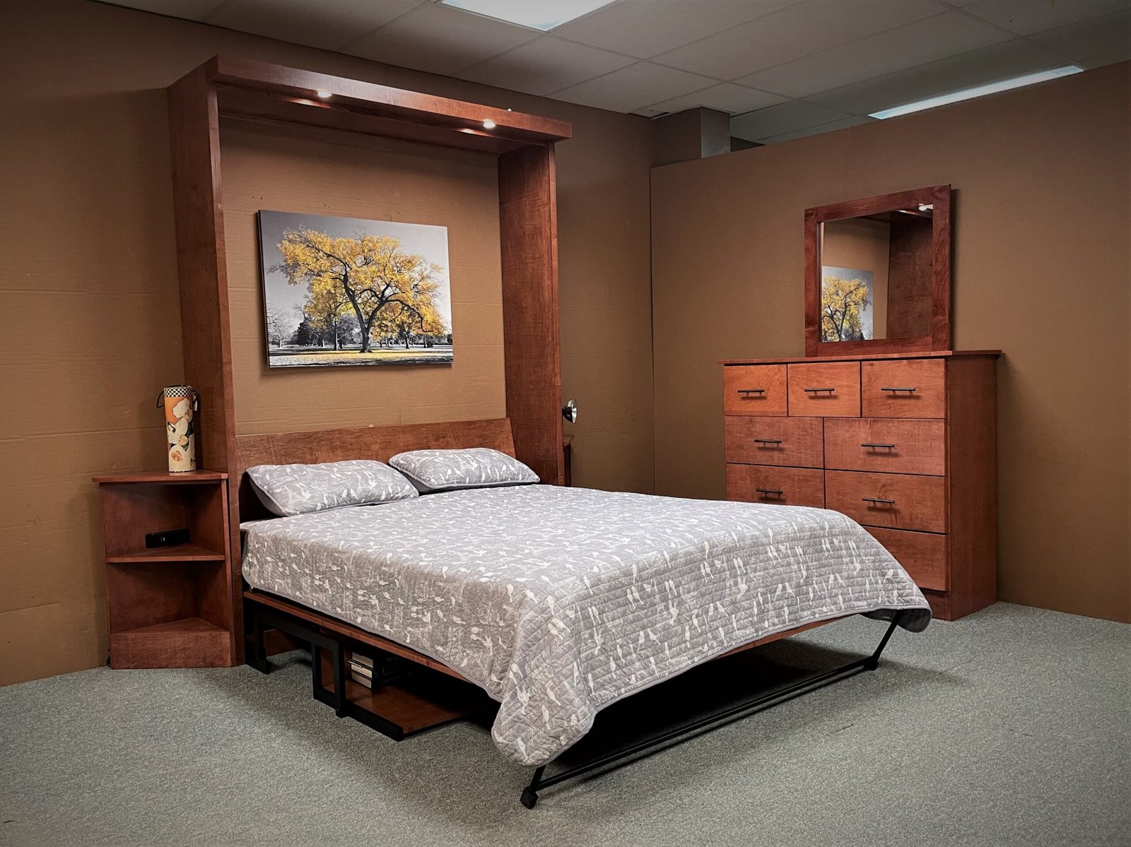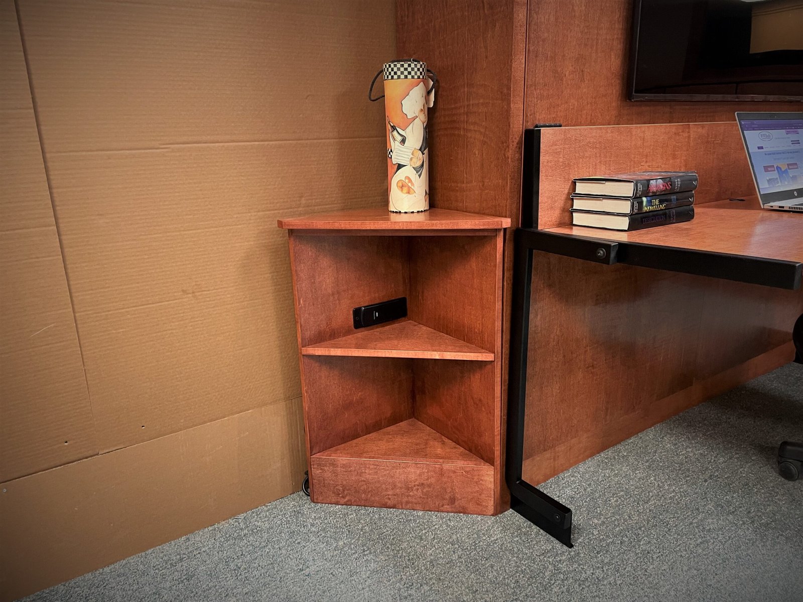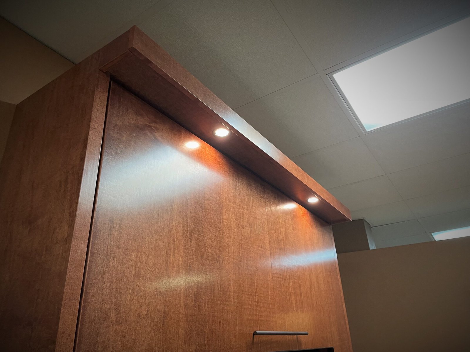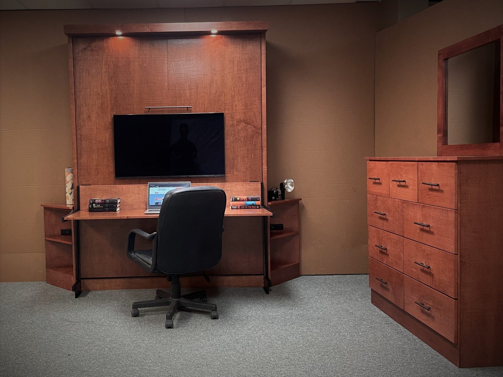 Outset Lights – Outset lights are mounted on the exterior of the cabinet and are controlled from two locations: the headboard when the bed is open and the side of the cabinet in the office position. In the office setup, the lights illuminate the desk area, while in the bed position they function as reading lights. The bookcase lights are tied into the same control system for coordinated lighting.