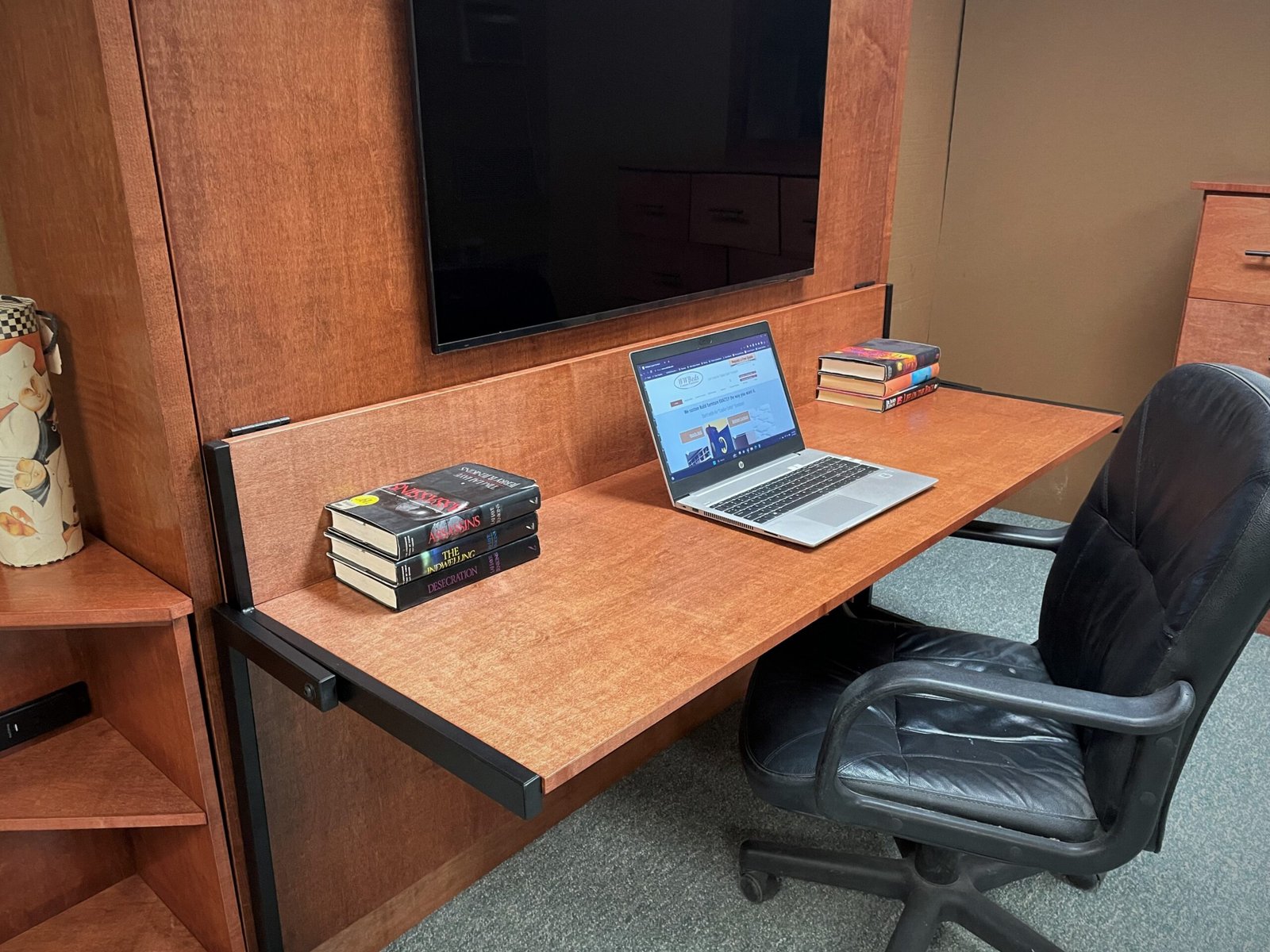 Stay Level Desk – The Stay Level Desk remains level as it transitions into a bed, with no need to completely clear the surface when moving from the closed office setup to the open bed position. This allows the room to function as both a home office and a guest bedroom. A built-in charging station is located under the desk, with wire access from the top. It includes two standard outlets, one USB-A, and one USB-C fast-charge port.