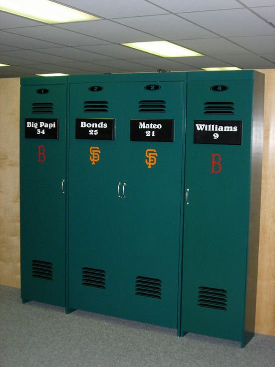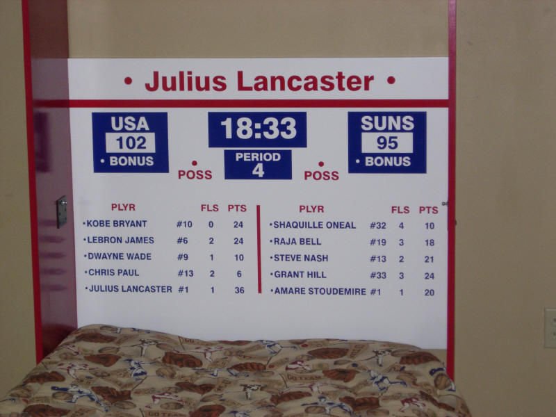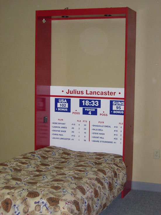 The is a murphy wall bed designed with a locker theme. This one is a USA basketball theme in blue and red. Any team is available. The locker doors come down to form the bed. Bookcases can be added.