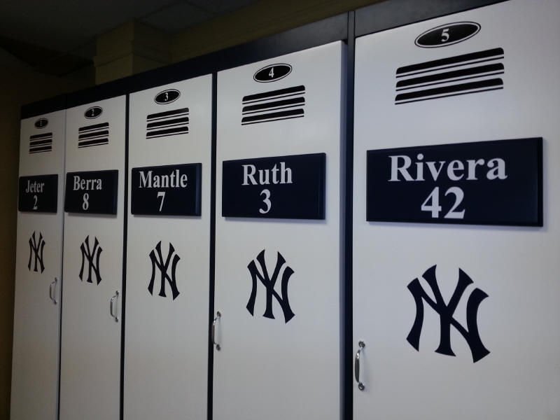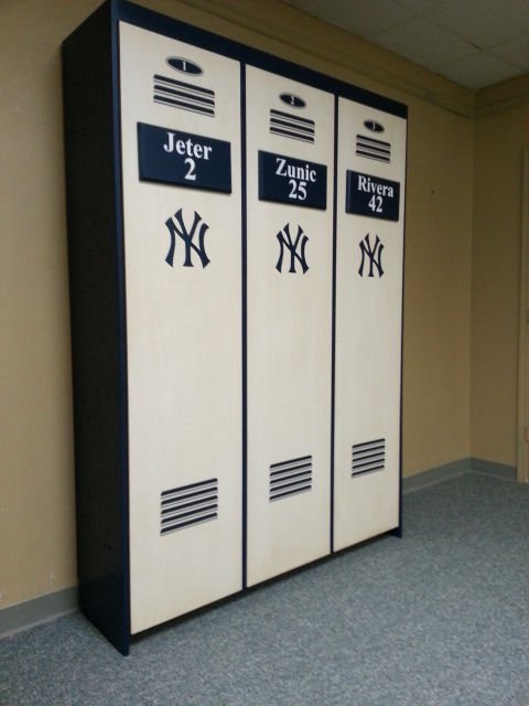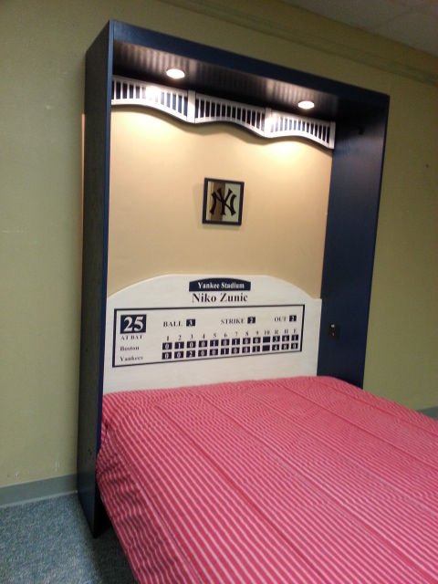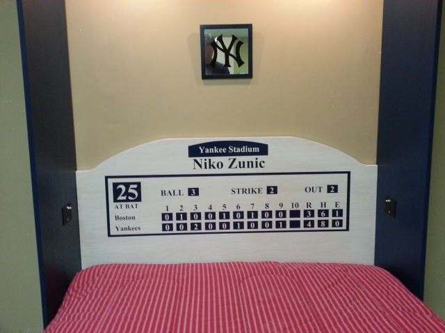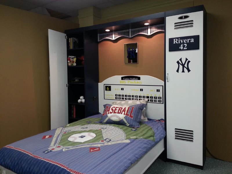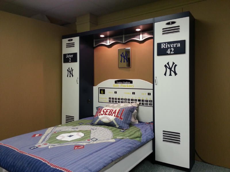 The is a murphy wall bed desinged with a locker theme. This one has the New York Yankees theme but any team is avaliable. The three center doors are false and come down with the bed. The outer bookcases are actual working bookcases.