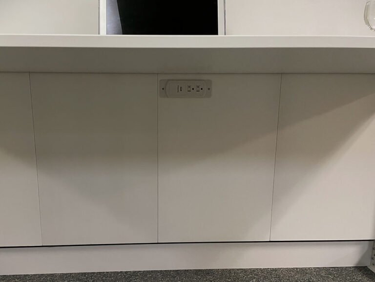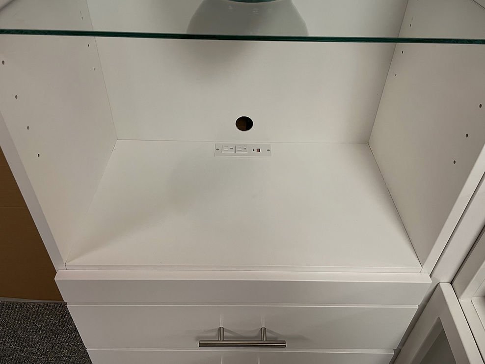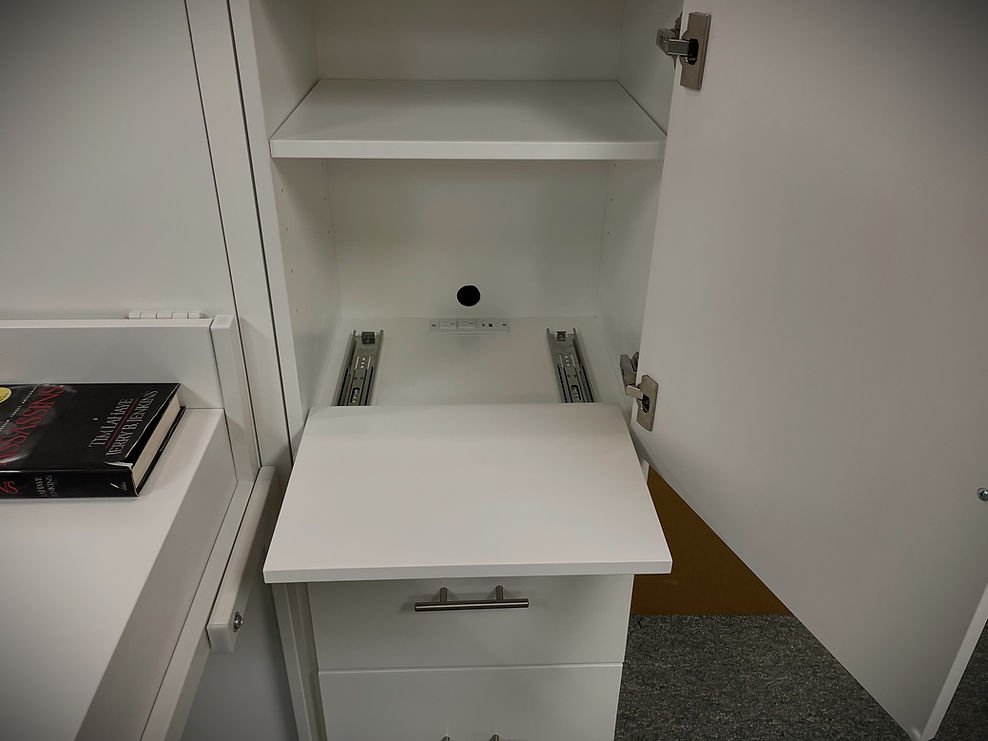 Greenberg 08/15/24 White Lacquer Alpine Murphy Bed Showing the Under Desk Charging Station