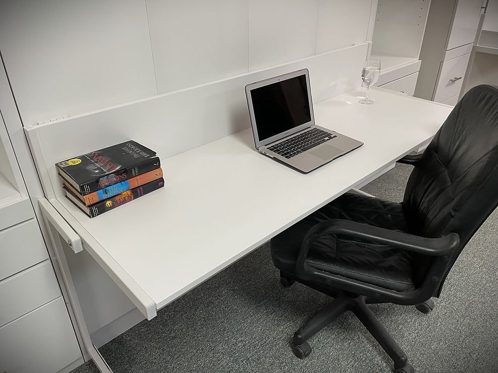 Greenberg 08/15/24 White Lacquer Alpine Murphy Bed Showing the Stay Level Desk