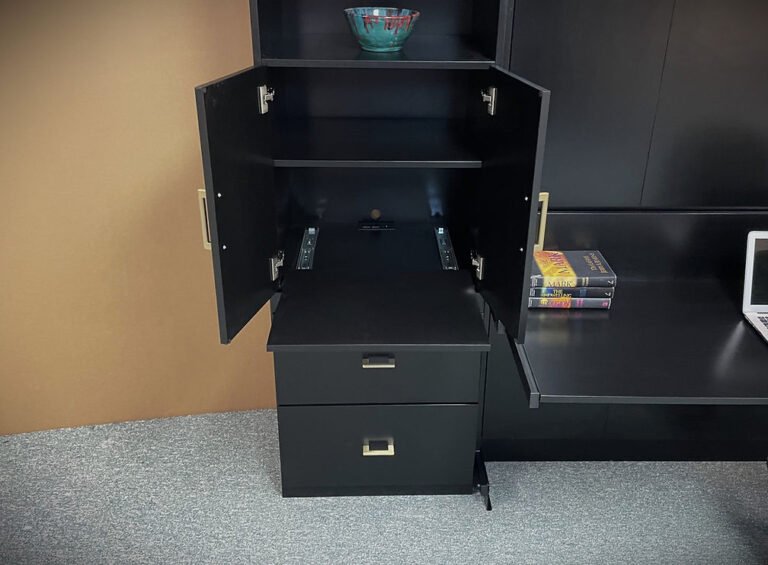 Eckholt 9/13/24 Black Lacquer Queen Alpine Murphy Bed Showing the Printer Pullout