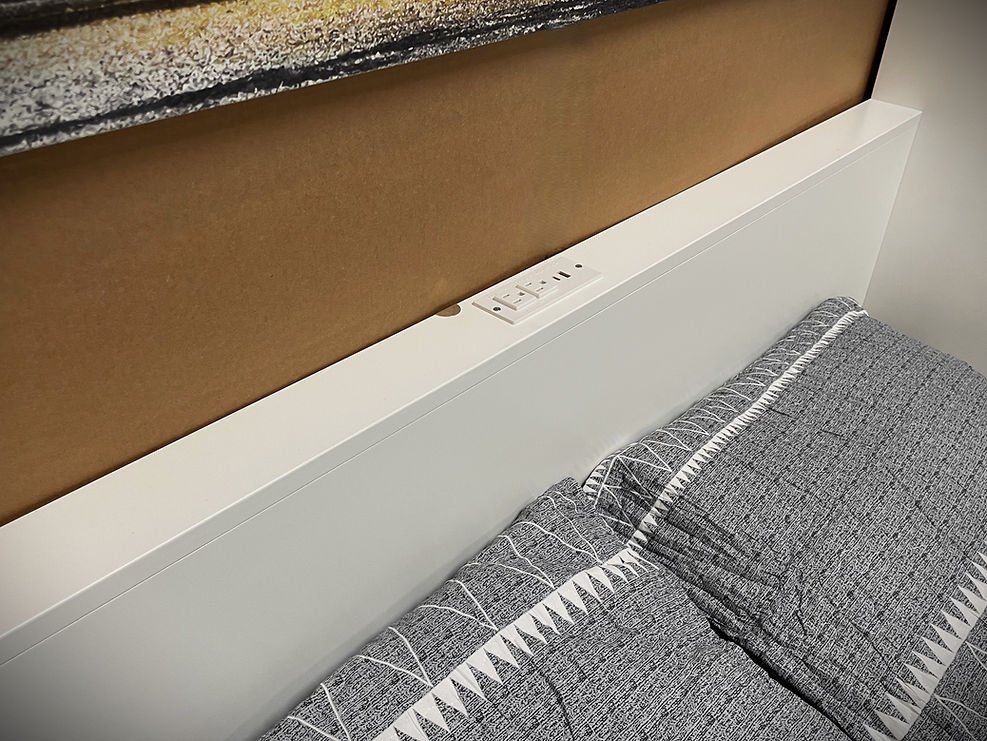 Cress-Elliott 9/3/24 White Lacquer Frank Lloyd Wright Inspired Murphy Bed Showing the Outlet Under the Desk
