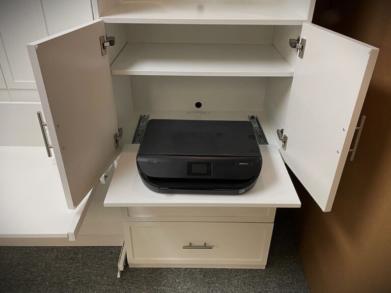 Cress-Elliott 9/3/24 White Lacquer Frank Lloyd Wright Inspired Murphy Bed Showing the Printer Pullout