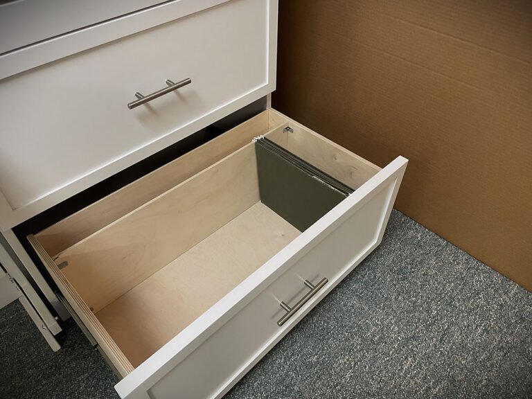 Cress-Elliott 9/3/24 White Lacquer Frank Lloyd Wright Inspired Murphy Bed Showing the File Drawers