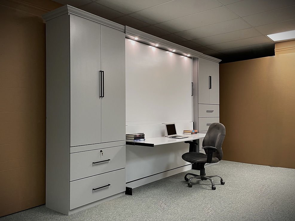 Sigety 08/21/24 Two Toned King Murphy Bed with Projector Screen Showing the Under Desk Charging Station