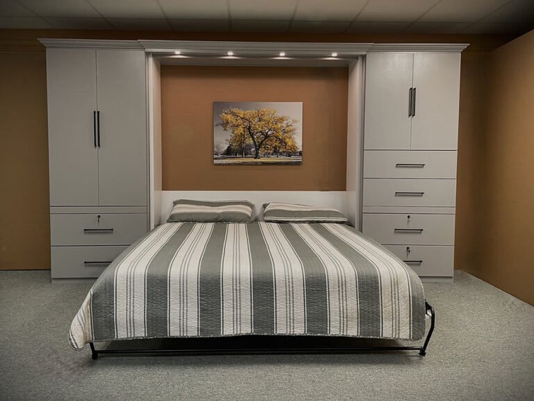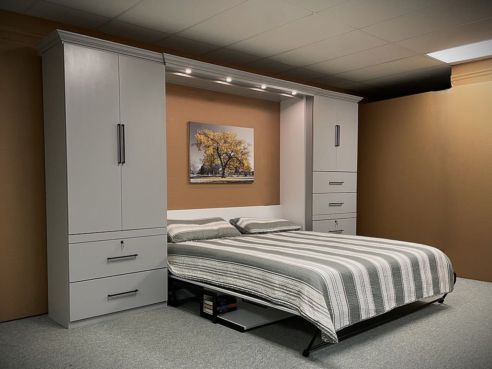 Sigety 08/21/24 Two Toned Kraftmaid Color Match King Wall Bed with Projector Screen Showing a Side View of Bed Closed