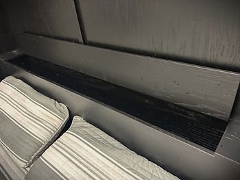 This style bed is called The Checker, since the design on the front looks similar to a checker board. This is a King size unit and fits a standard 76″ x 80″ mattress. The applied finish is a Black Lacquer on Red Oak wood. We did a matte finish, so it was not super shiny. We also added distressing so that it had more of a “rustic” look for the garage.