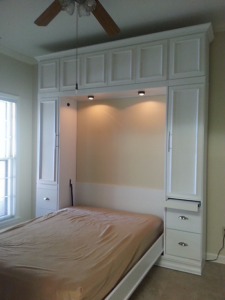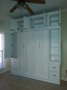 To help meet this need, we added bookcases on the sides. The size of the bookcases were carefully chosen to equal the four section face of the murphy bed. This kept a consistent 14 1/2″ width doors across the face and bookcases. Care was also taken with the upper cabinet. We took advantage of the customer’s high ceilings and added cabinets above the bed and bookcases. Instead of just subdividing the cabinet into 6 equal spaces, we made sure they aligned with the lower doors.