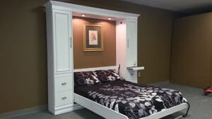 Why is this called the New Yorker? I’m glad you asked. We called this Murphy bed style the New Yorker because we sent the first one to New York. Actually we sent it to comedian Jim Gaffigan’s house (excuse the shameless name-dropping). The New Yorker we built for Mr. Gaffigan had a double fold desk that came out 80″ from the face. Photos of that bed can be seen by clicking the New Yorker Murphy bed link below.